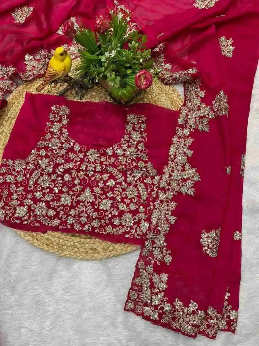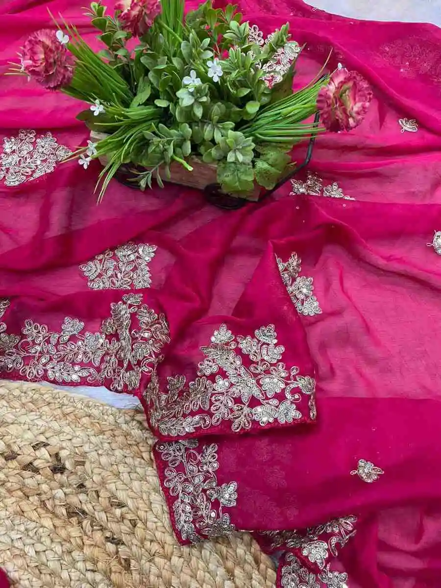 SAREE FABRIC : PREMIUM DIAMOND CHINON SILK WITH HEAVY EMBROIDERY CODING MULTI TREAD & SEQUENCE WORK WITH PIPING BORDER