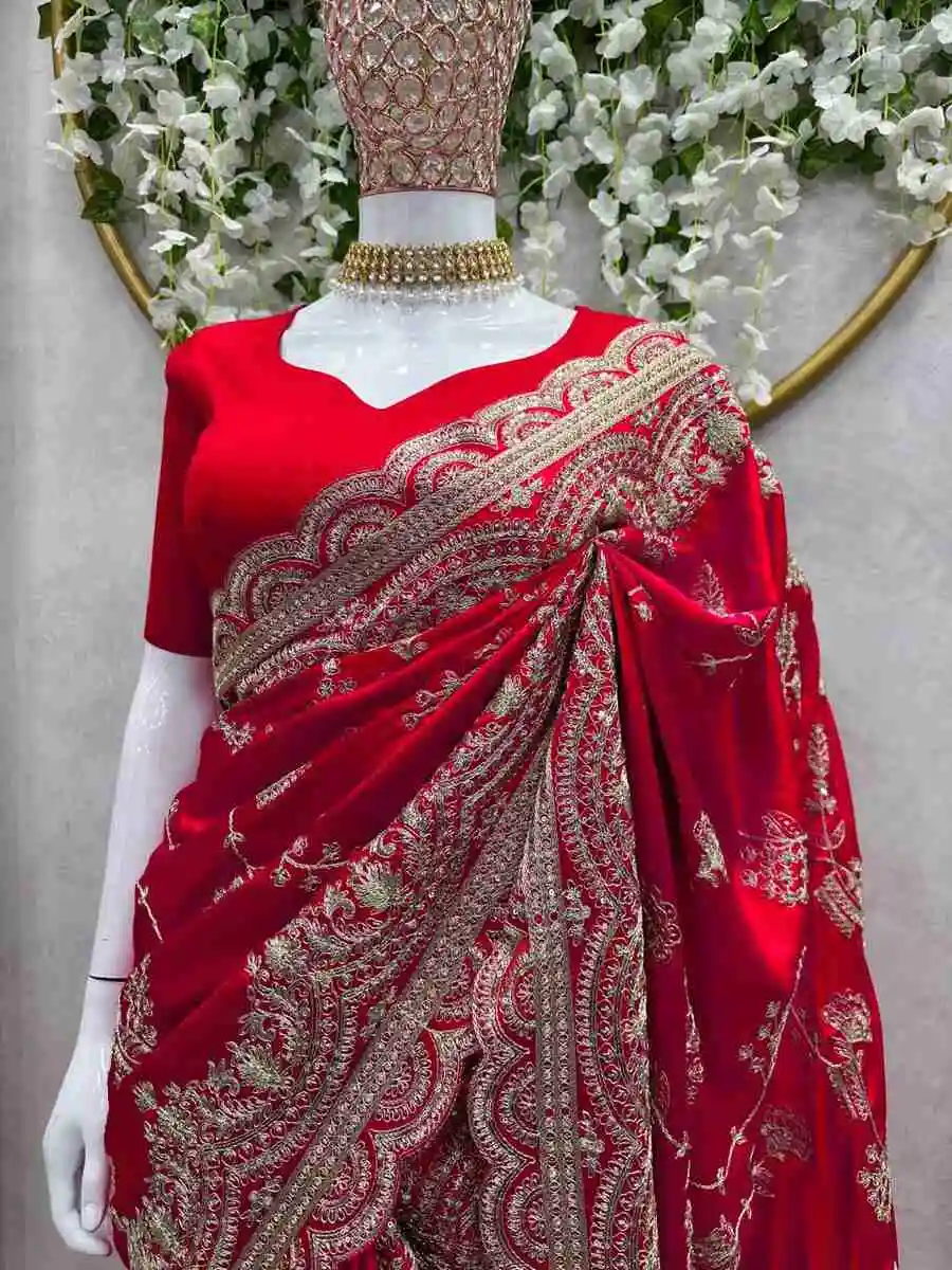 DESIGNER RANGOLI SILK THREAD EMBROIDERY CODING SEQUENCE WORK SAREE WITH UNSTITCHED BLOUSE RED