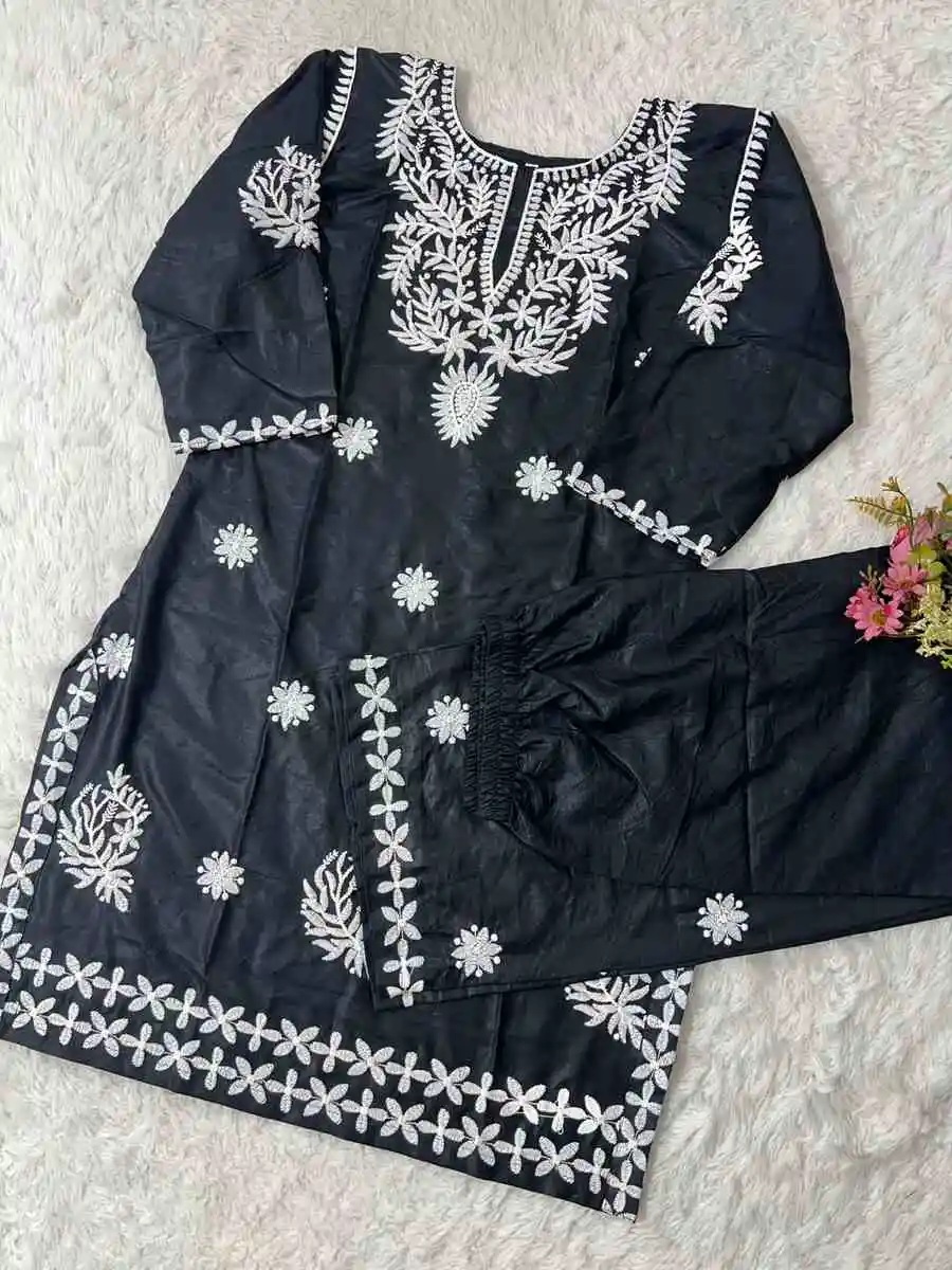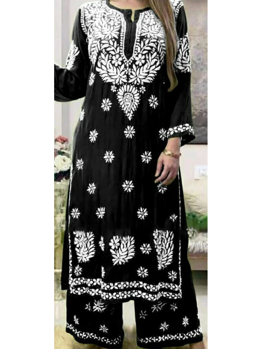 DESIGNER RAYON COTTON EMBROIDERY WORK KURTI PALAZZO SET BLACK