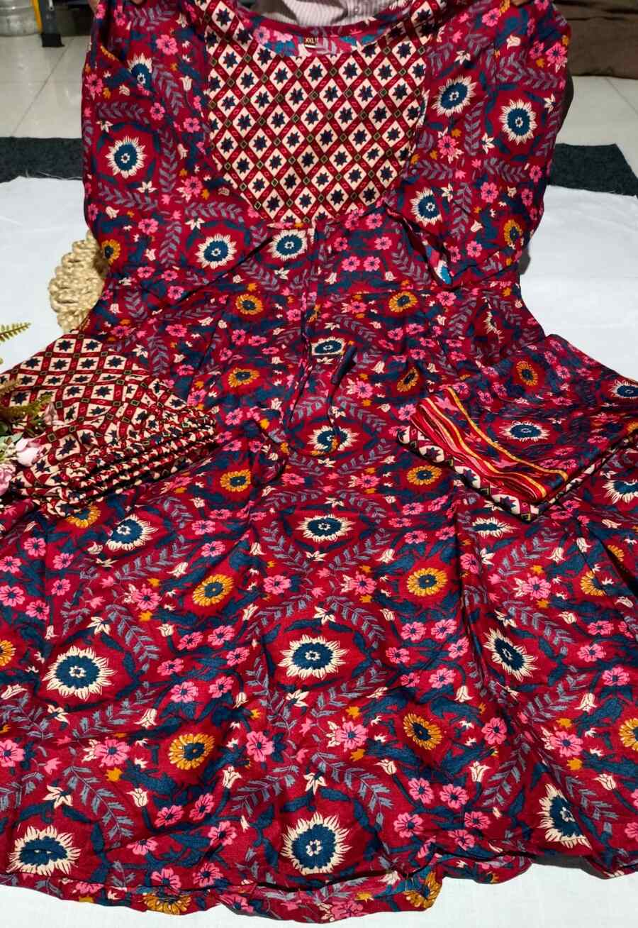 DESIGNER RAYON PRINTED WORK TOP BOTTOM WITH DUPATTA MAROON