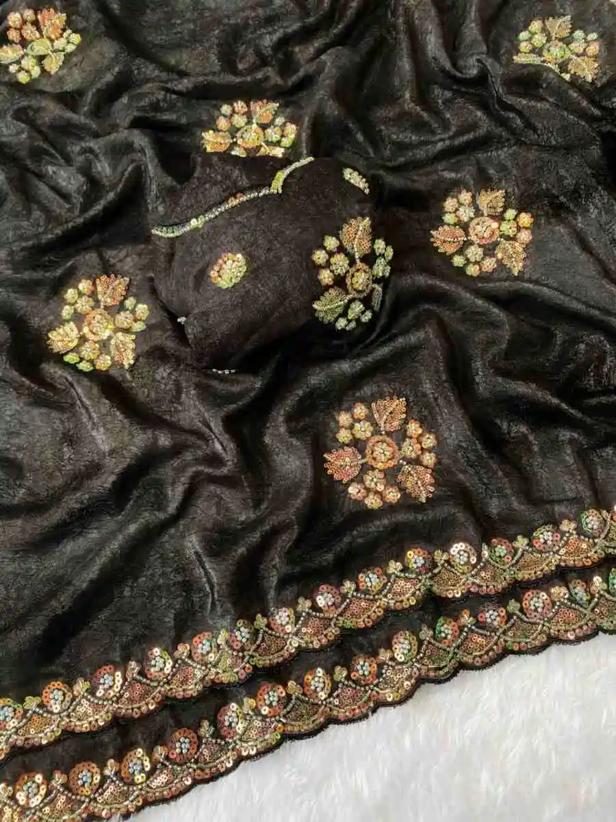 DESIGNER ROBIN HOOD ORIGINAL BEEDS WORK WITH FLORAL WORK SAREE WITH UNSTITCHED BLOUSE BLACK