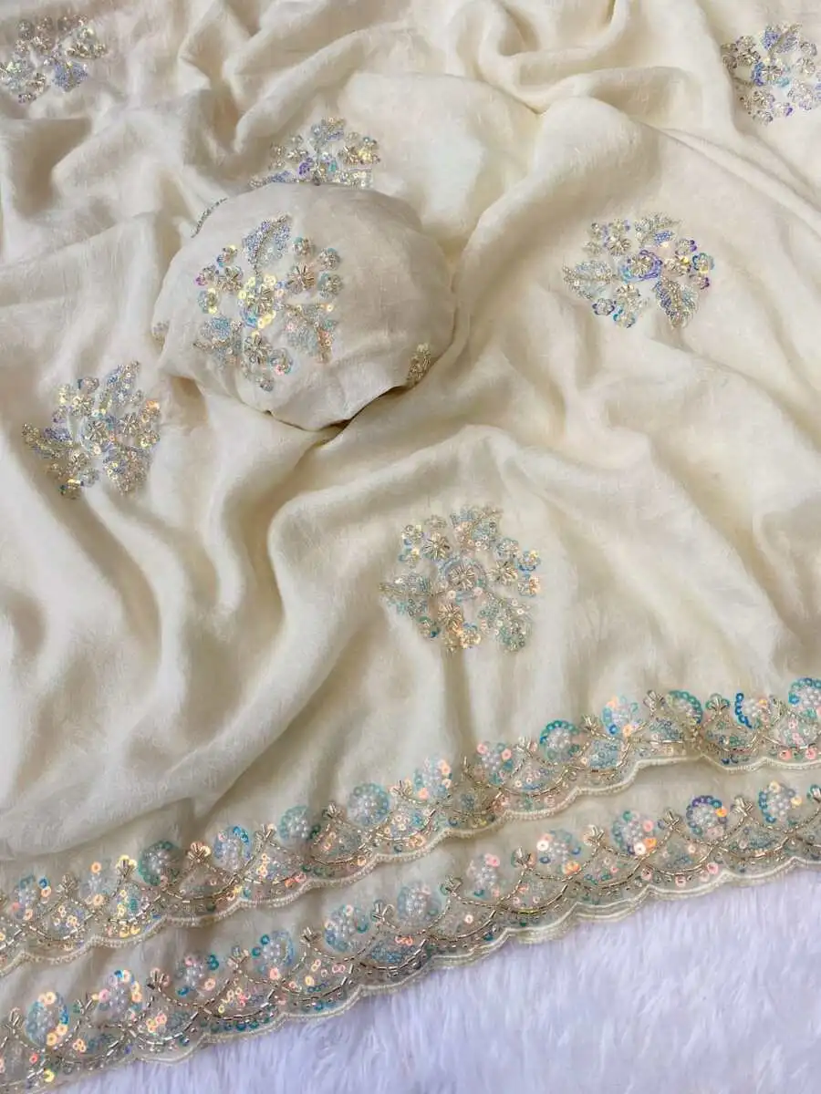 SAREE FABRIC : PREMIUM DIAMOND CHINON SILK WITH HEAVY EMBROIDERY CODING MULTI TREADS AND SEQUENCE WORK