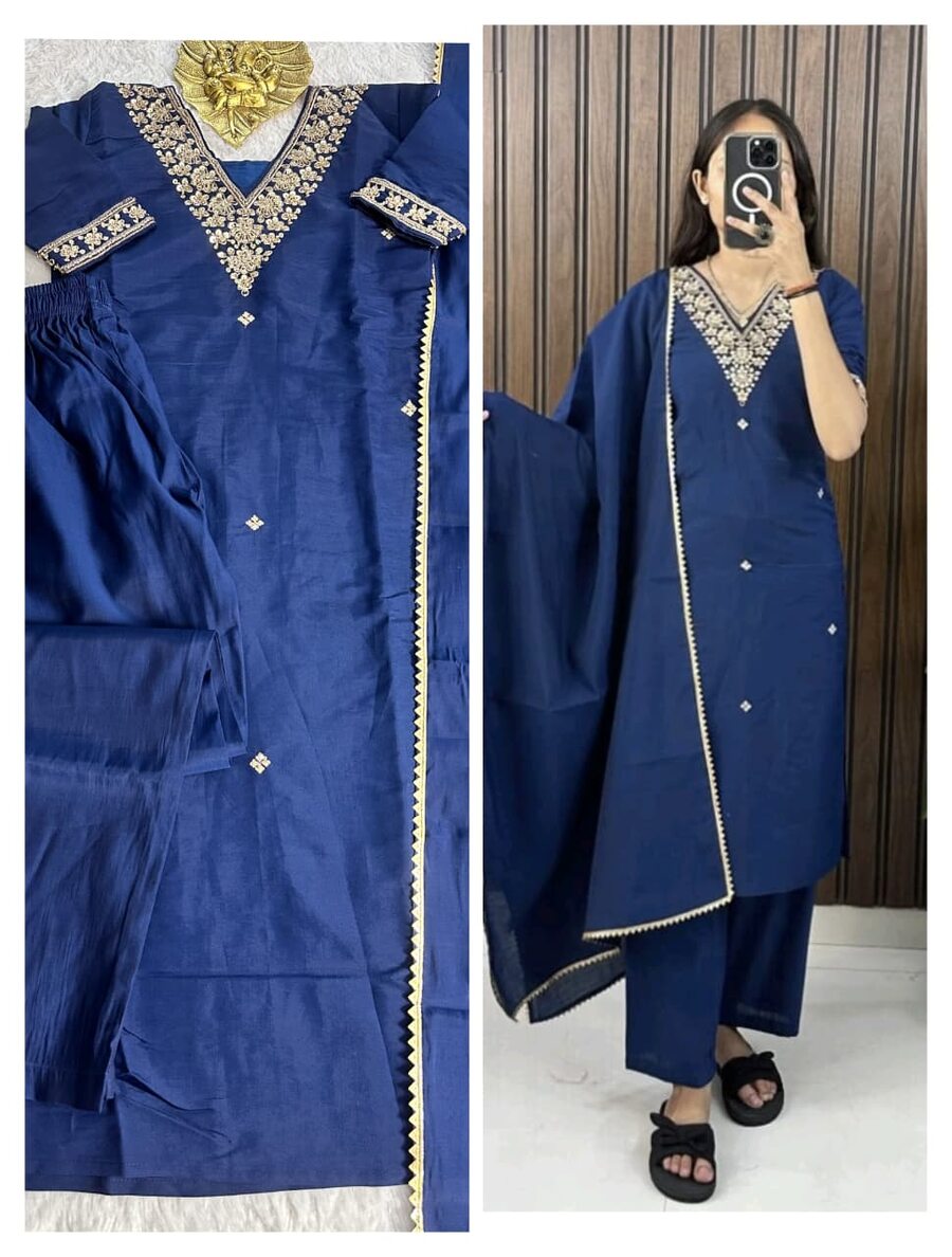 DESIGNER ROMAN COTTON MOTI HANDWORK WITH ZARI EMBROIDERY WORK TOP BOTTOM WITH DUPATTA BLUE