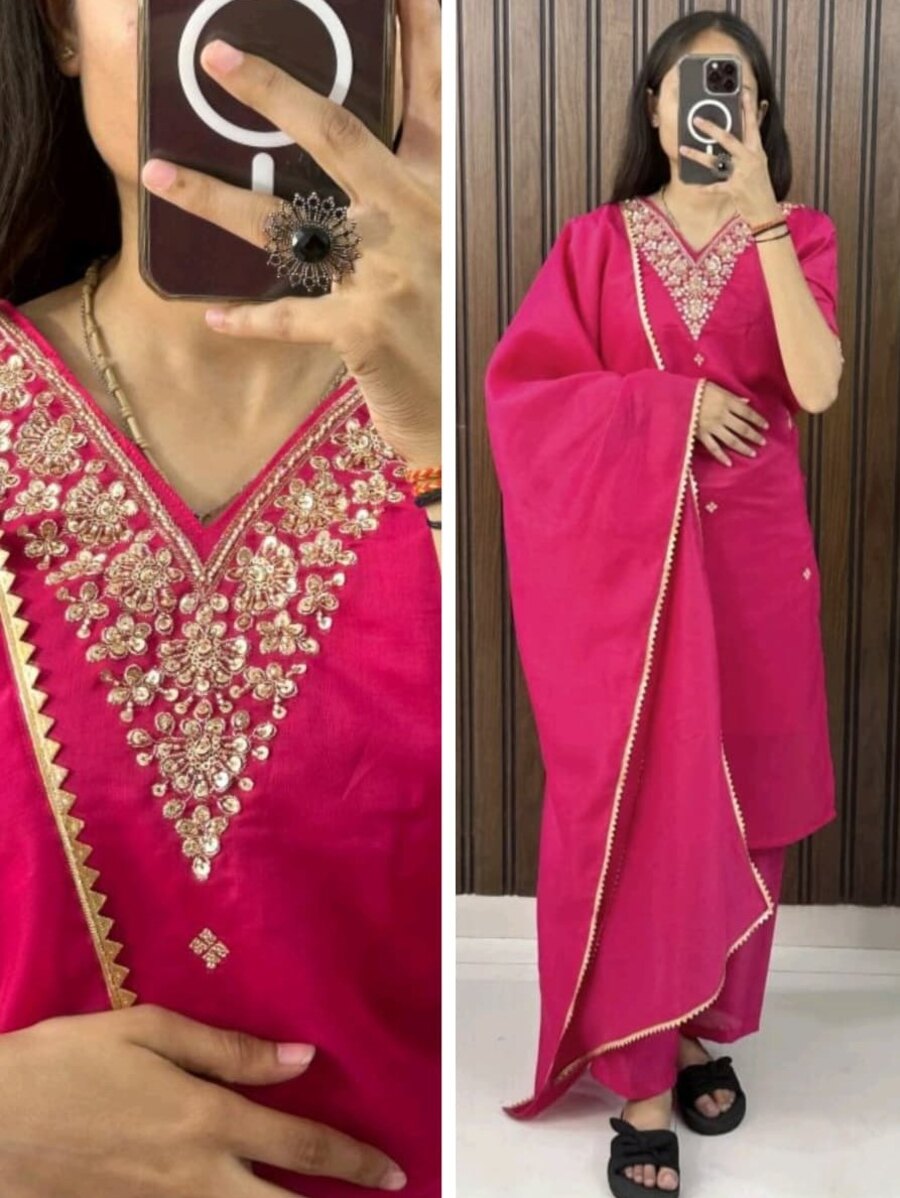 DESIGNER ROMAN COTTON MOTI HANDWORK WITH ZARI EMBROIDERY WORK TOP BOTTOM WITH DUPATTA PINK