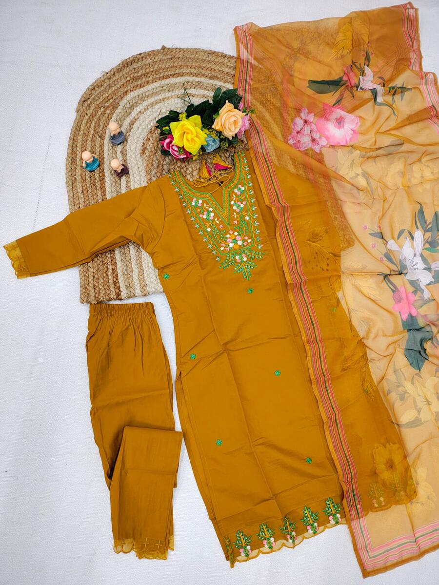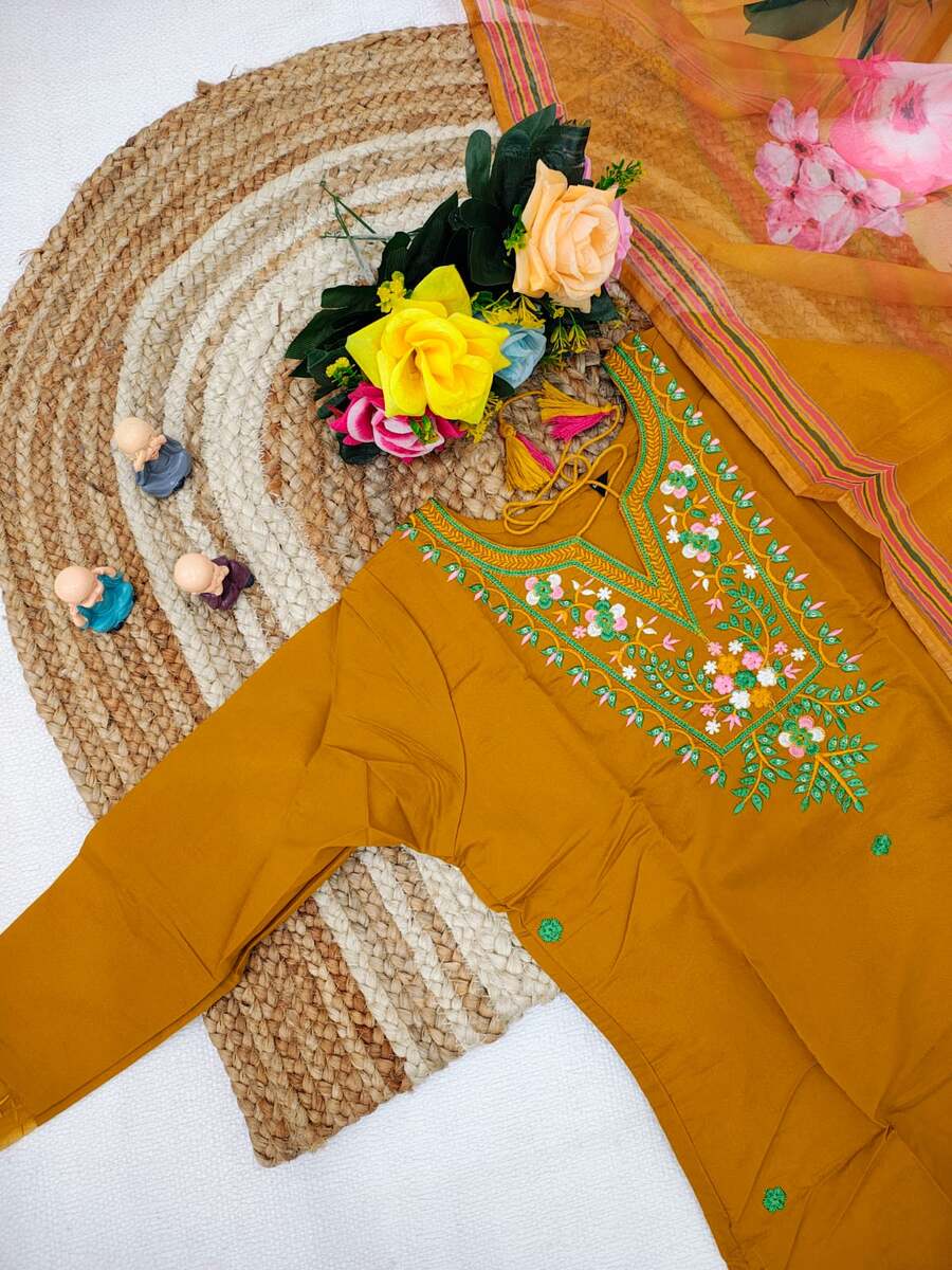 DESIGNER ROMAN EMBROIDERY WORK TOP BOTTOM WITH DUPATTA YELLOW