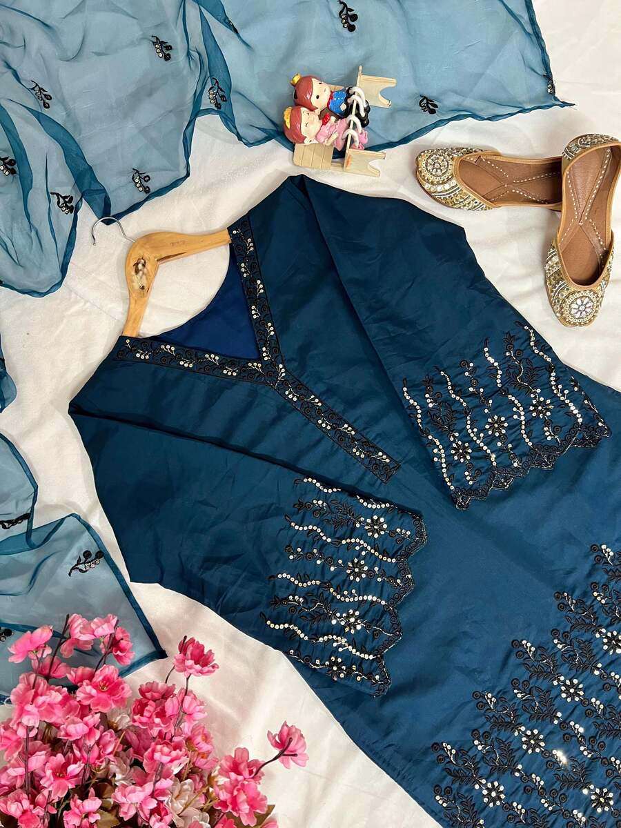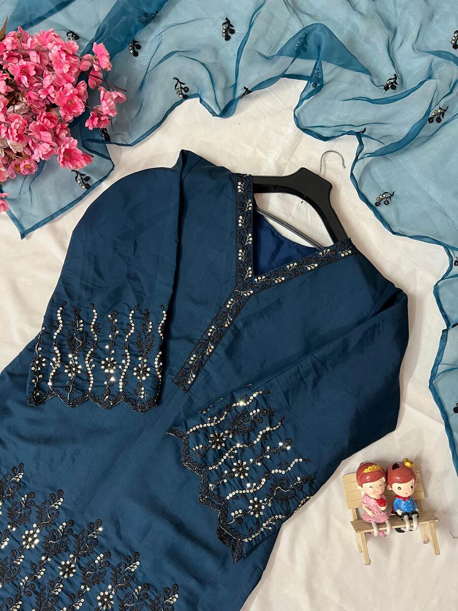 DESIGNER ROMAN SILK COTTON ZARI, THREAD & SEQUENCE EMBROIDERY WORK TOP PALAZZO WITH DUPATTA NAVY BLUE