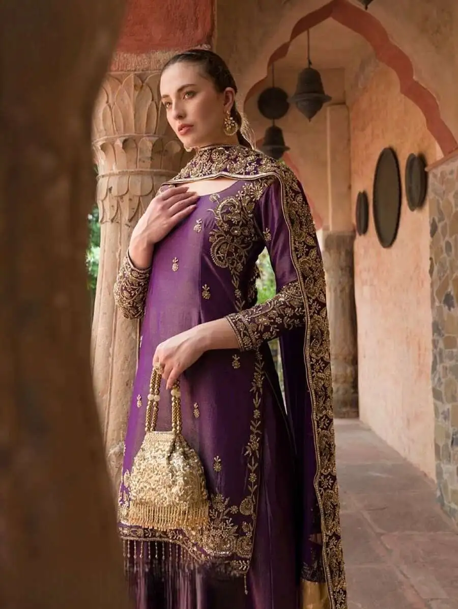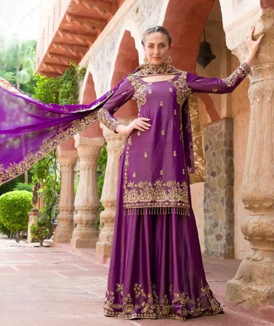 DESIGNER ROMAN SILK EMBROIDERY SEQUENCE WORK TOP PALAZZO WITH DUPATTA PURPLE