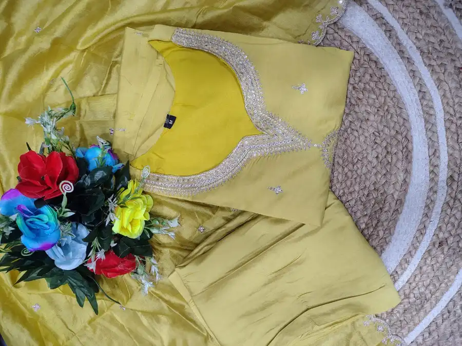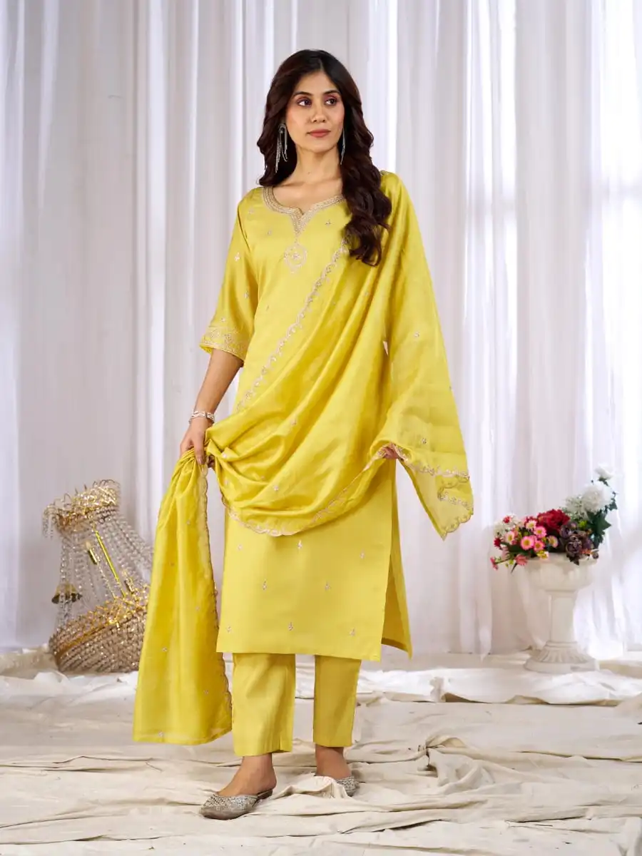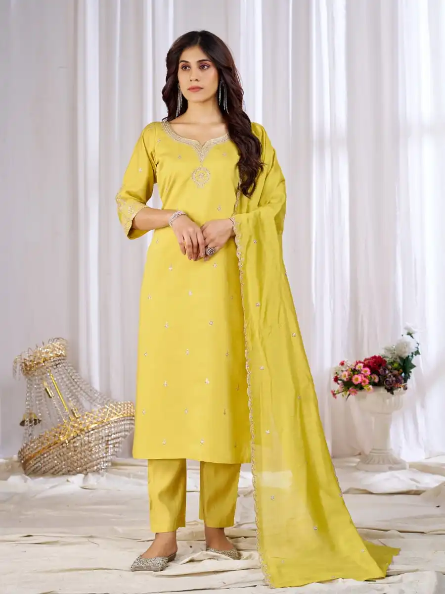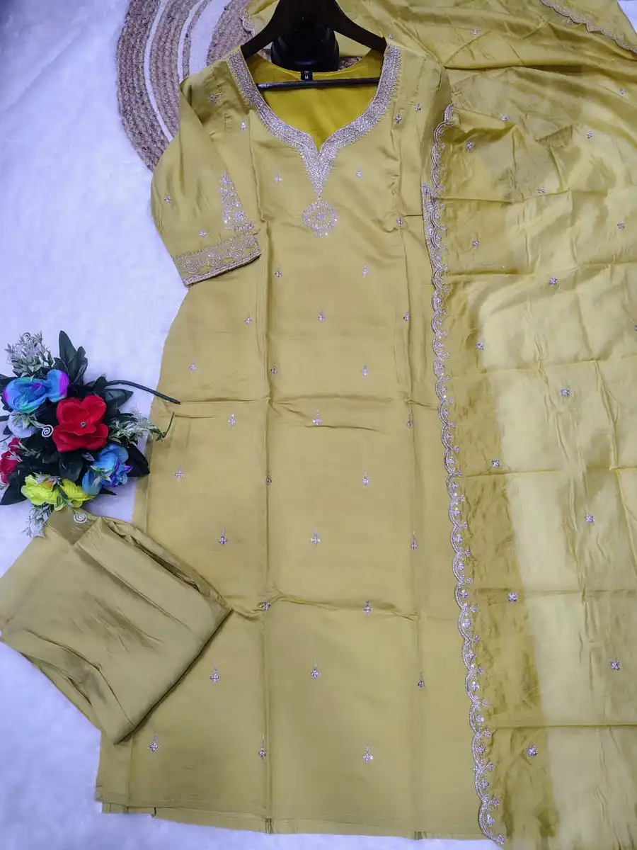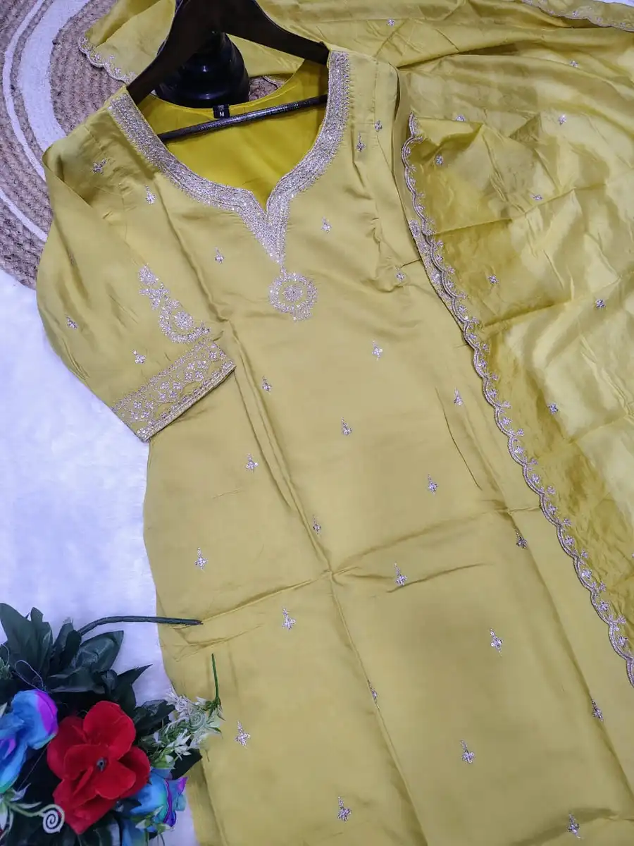DESIGNER ROMAN SILK EMBROIDERY WORK TOP BOTTOM WITH DUPATTA YELLOW