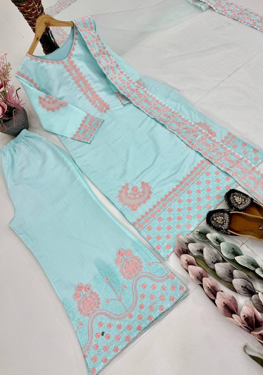 DESIGNER ROMAN SILK EMBROIDERY WORK TOP PALAZZO WITH DUPATTA SKY