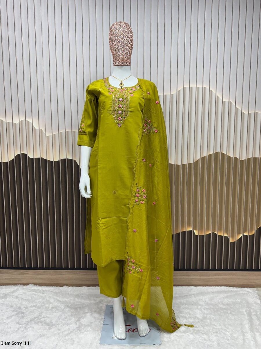 DESIGNER ROMAN SILK HAND WORK & EMBROIDERY WORK TOP BOTTOM WITH DUPATTA PARROT GREEN
