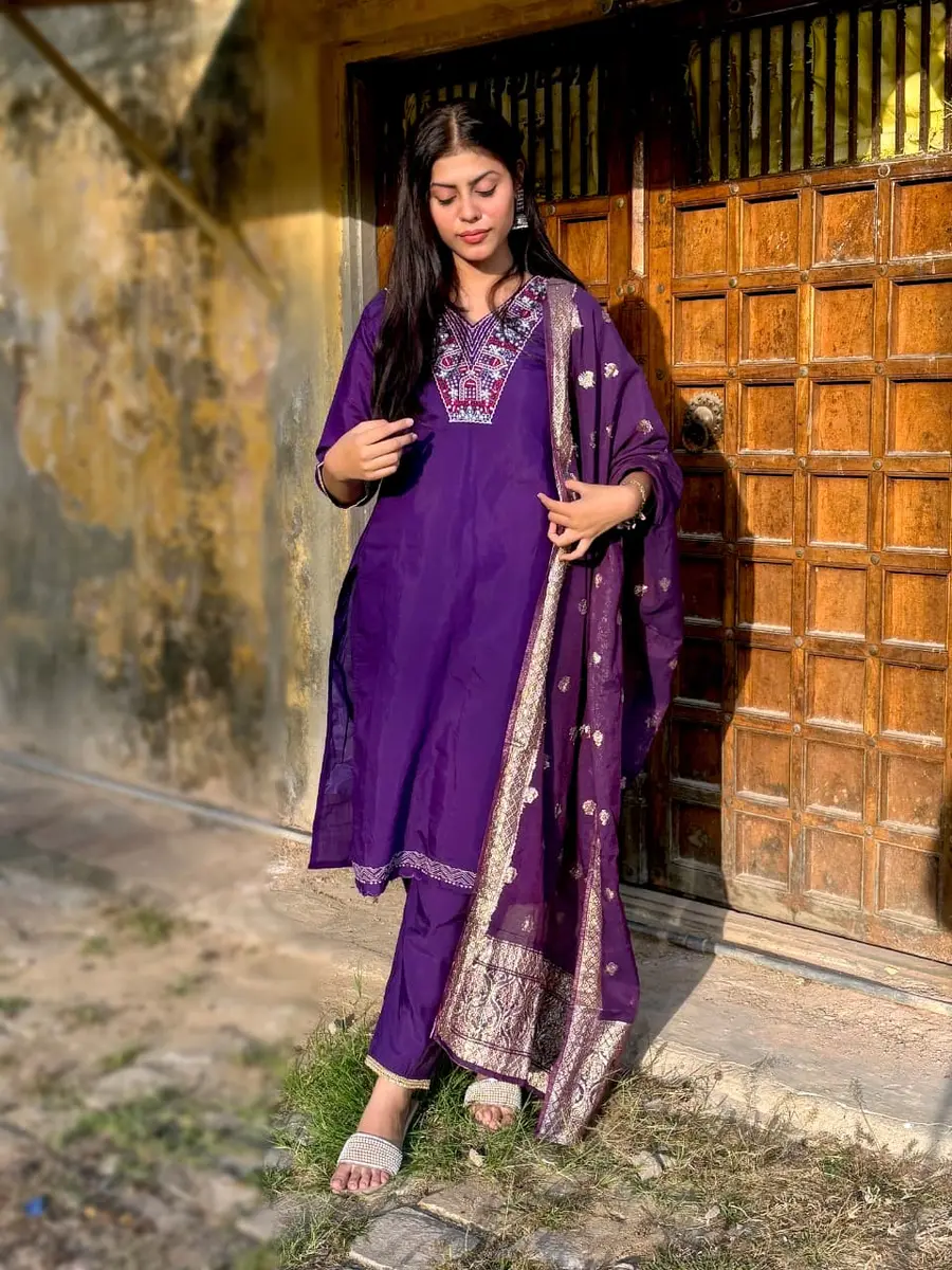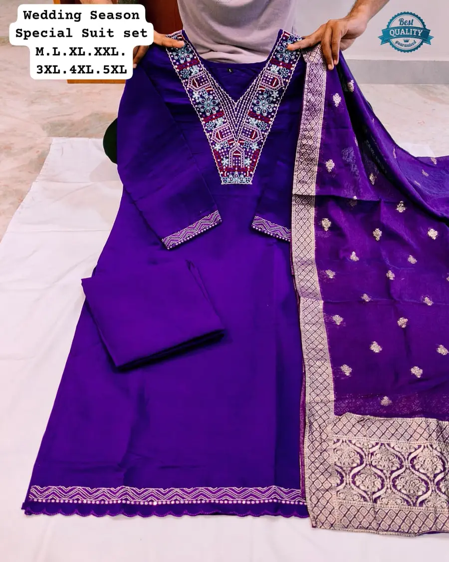 DESIGNER ROMAN SILK HANDWORK WITH SEQUENCE AND THREAD EMBROIDERY WORK TOP BOTTOM WITH DUPATTA PURPLE