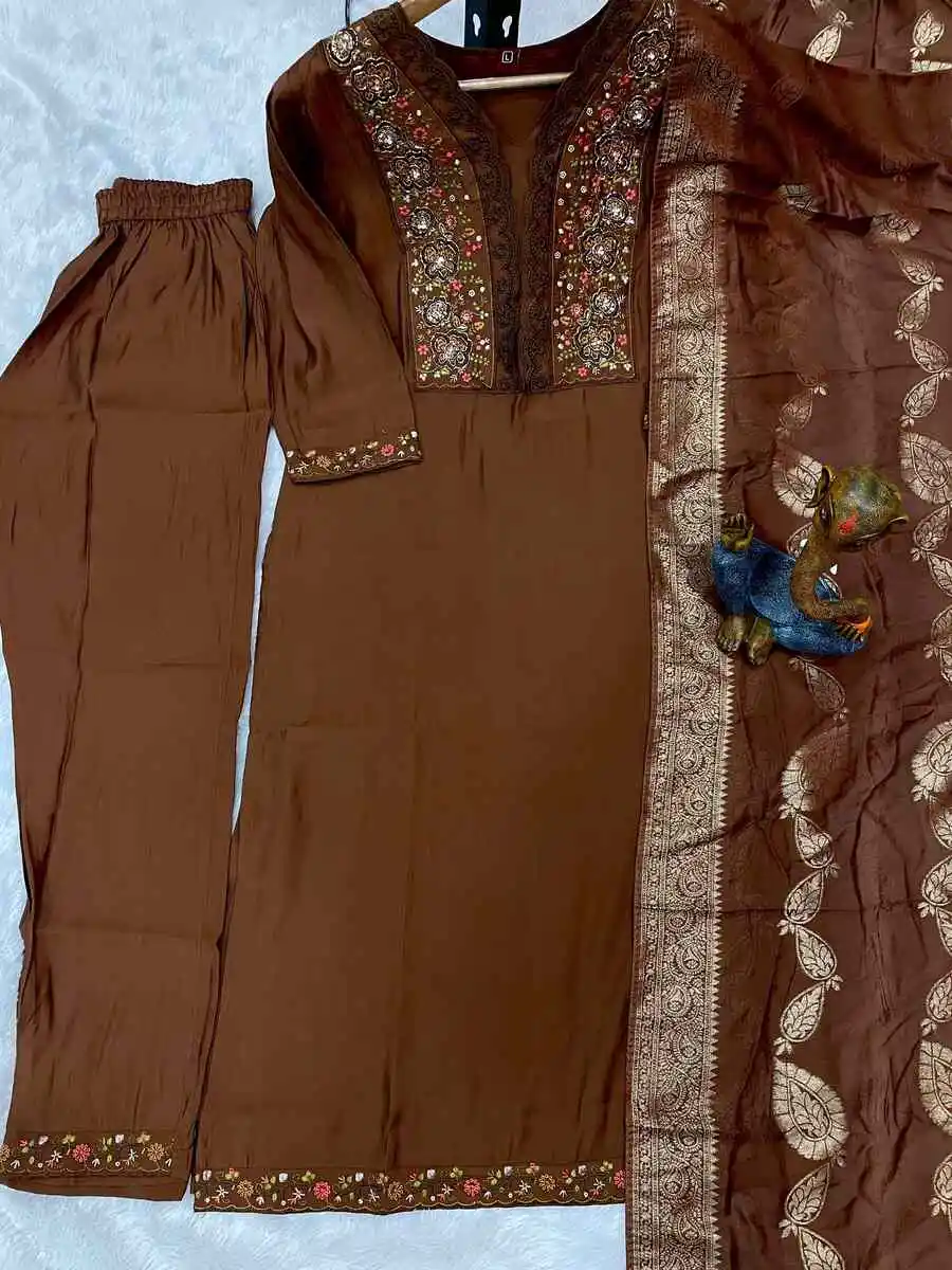 DESIGNER ROMAN SILK MULTI EMBROIDERY SEQUENCE WITH HAND WORK TOP BOTTOM WITH DUPATTA CHIKU