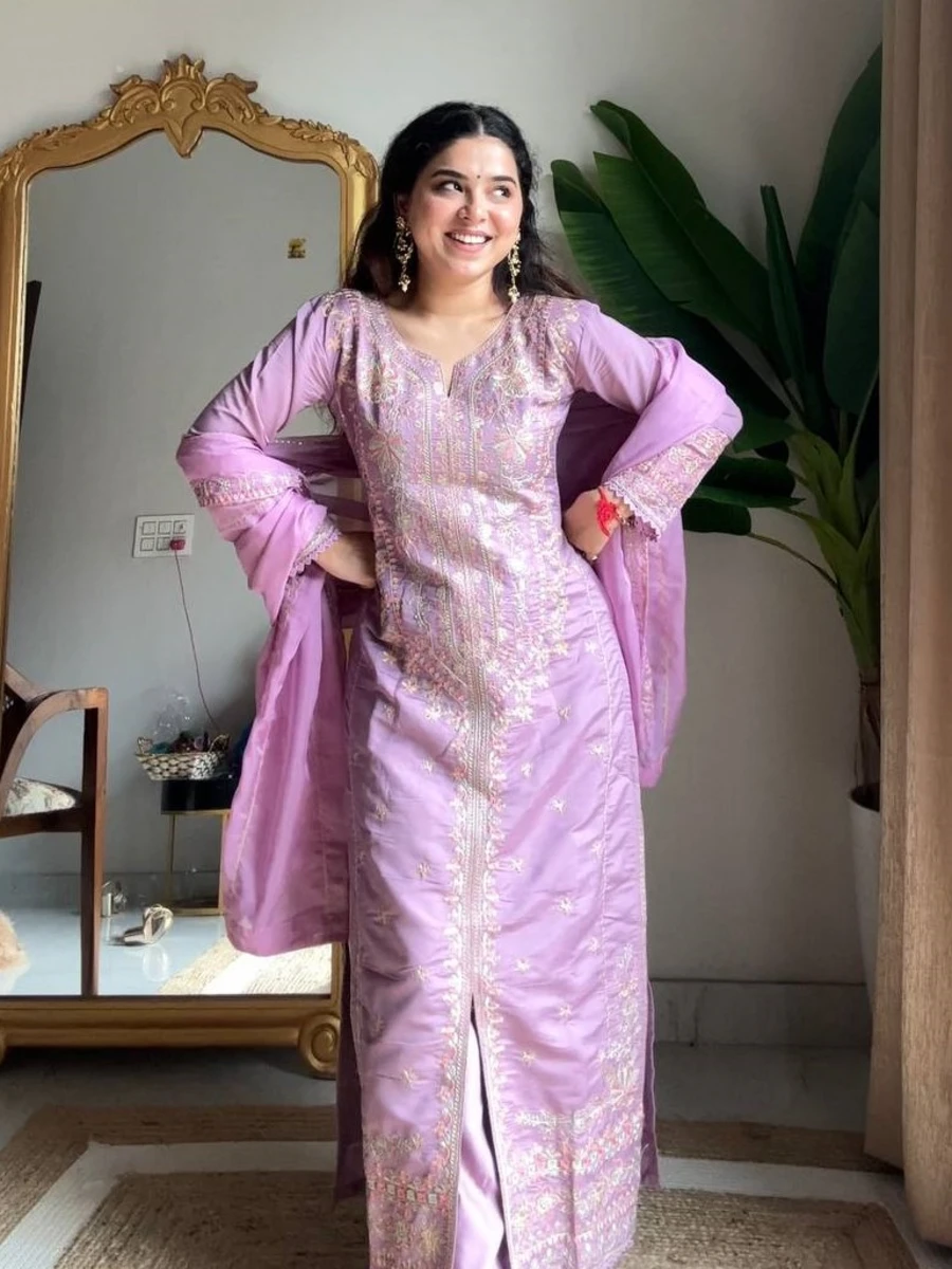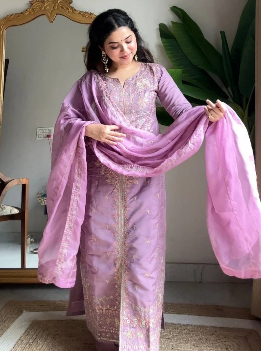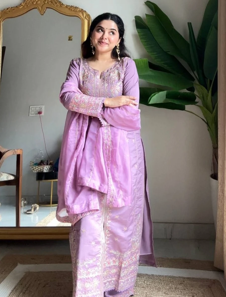 DESIGNER ROMAN SILK SEQUENCE EMBROIDERY WORK TOP PALAZZO WITH DUPATTA LAVENDER