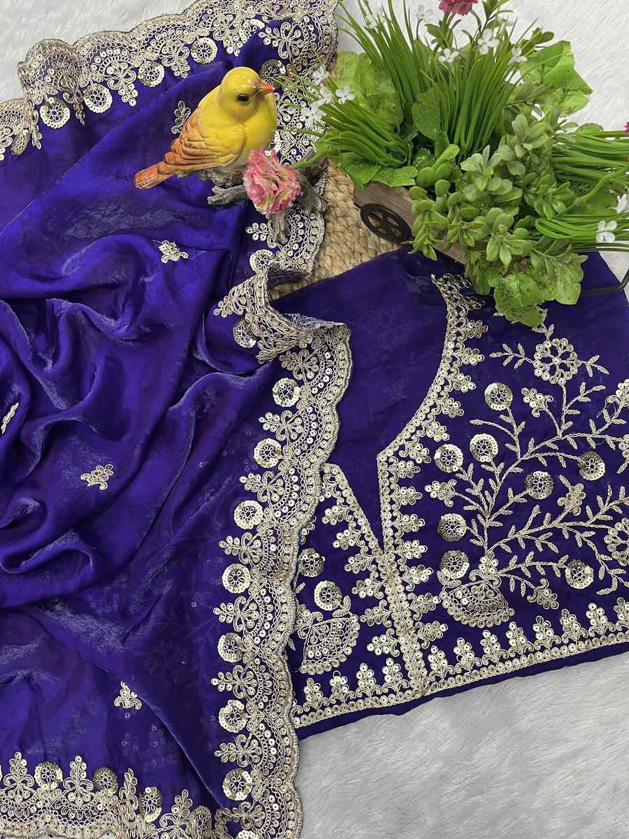 DESIGNER SATIN SILK SEQUENCE WITH JARI DORI EMBROIDERY WITH CUTWORK BORDER SAREE WITH UNSTITCHED BLOUSE PURPLE
