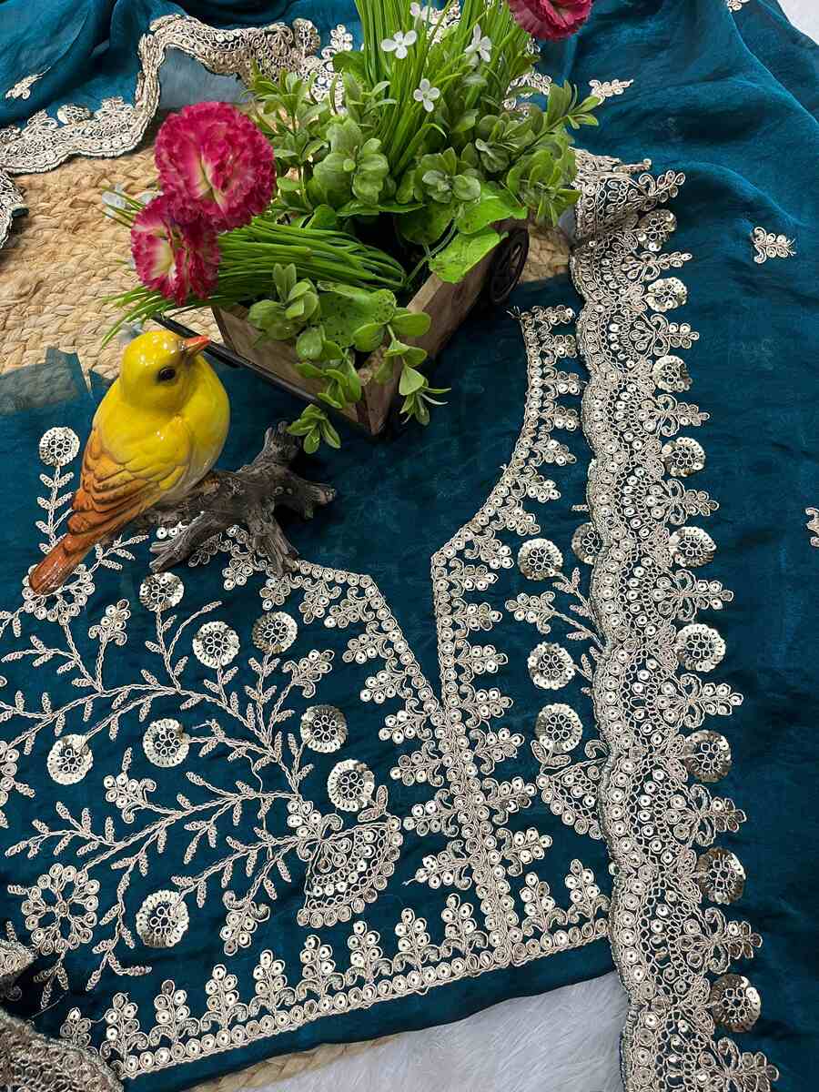 SAREE FABRIC : PREMIUM DIAMOND CHINON SILK WITH HEAVY EMBROIDERY CODING MULTI TREADS AND SEQUENCE WORK