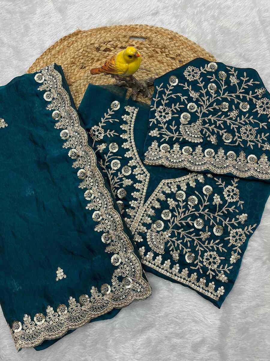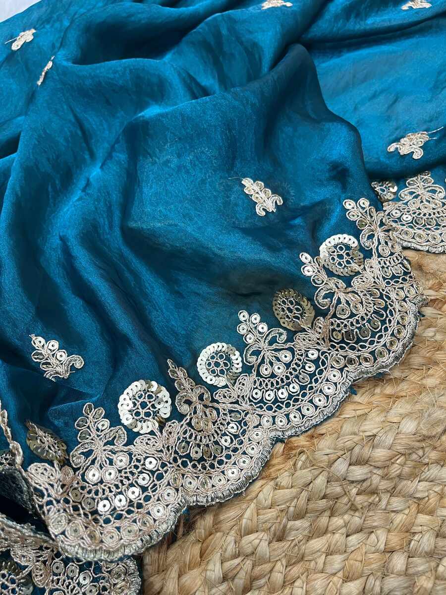 DESIGNER SATIN SILK SEQUENCE WITH JARI DORI EMBROIDERY WITH CUTWORK BORDER SAREE WITH UNSTITCHED BLOUSE RAMA