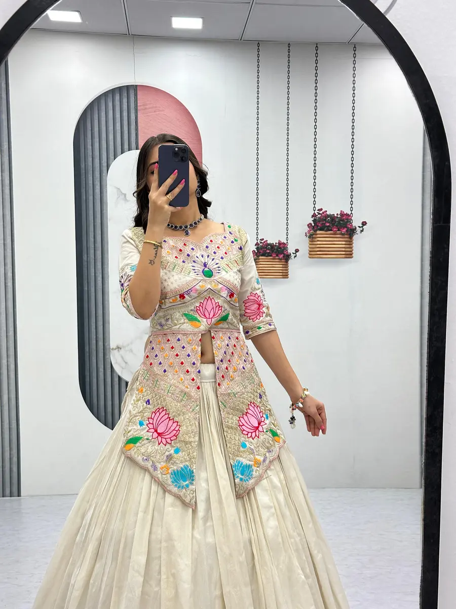 DESIGNER SHIMMER COSMOS EMBROIDERY SEQUENCE AND CODING WORK TOP LEHENGA SET OFF WHITE
