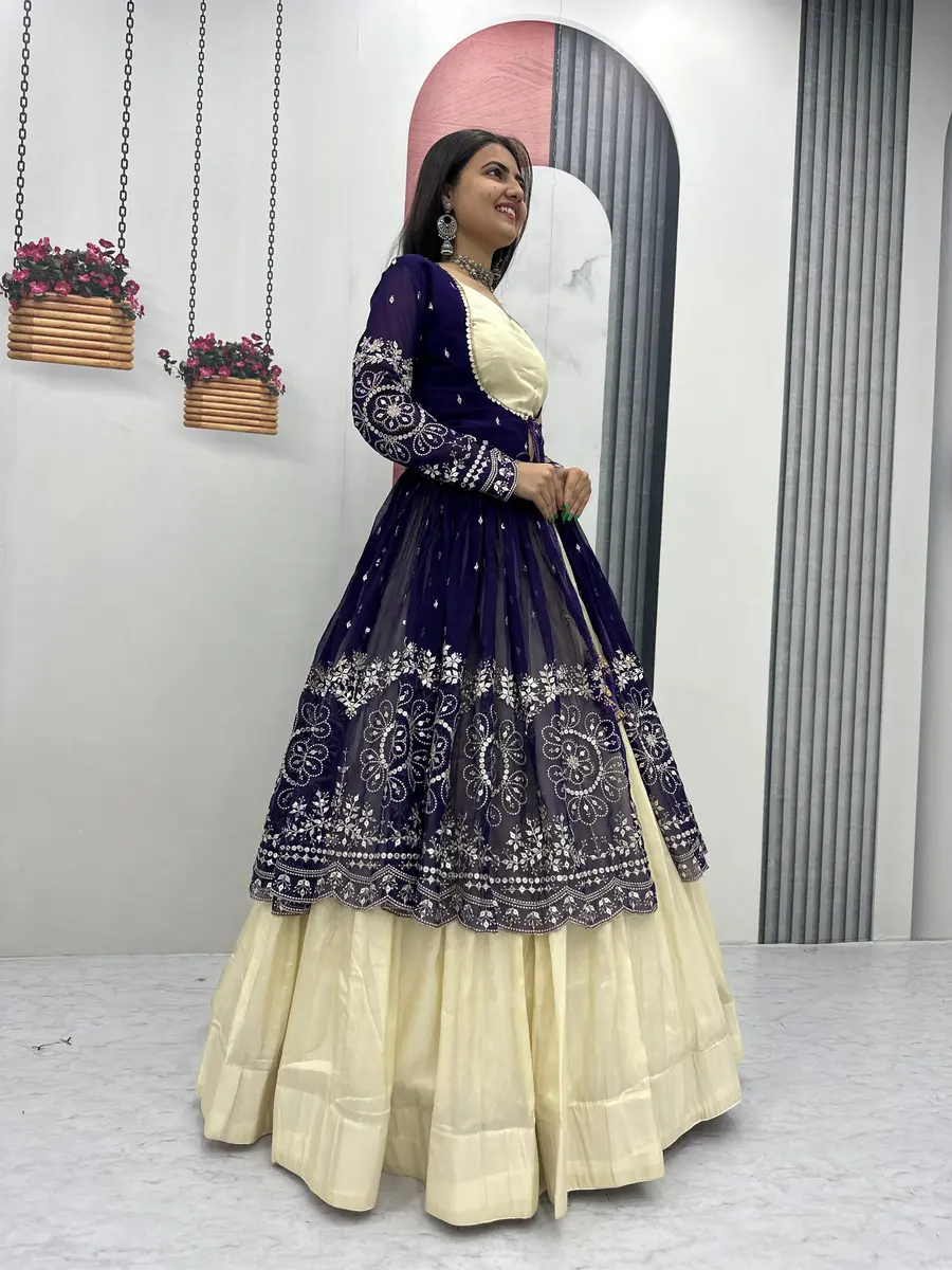 DESIGNER SHIMMER COSMOS PLAIN LEHENGA CHOLI WITH THREAD AND SEQUENCE WORK SHRUG PURPLE