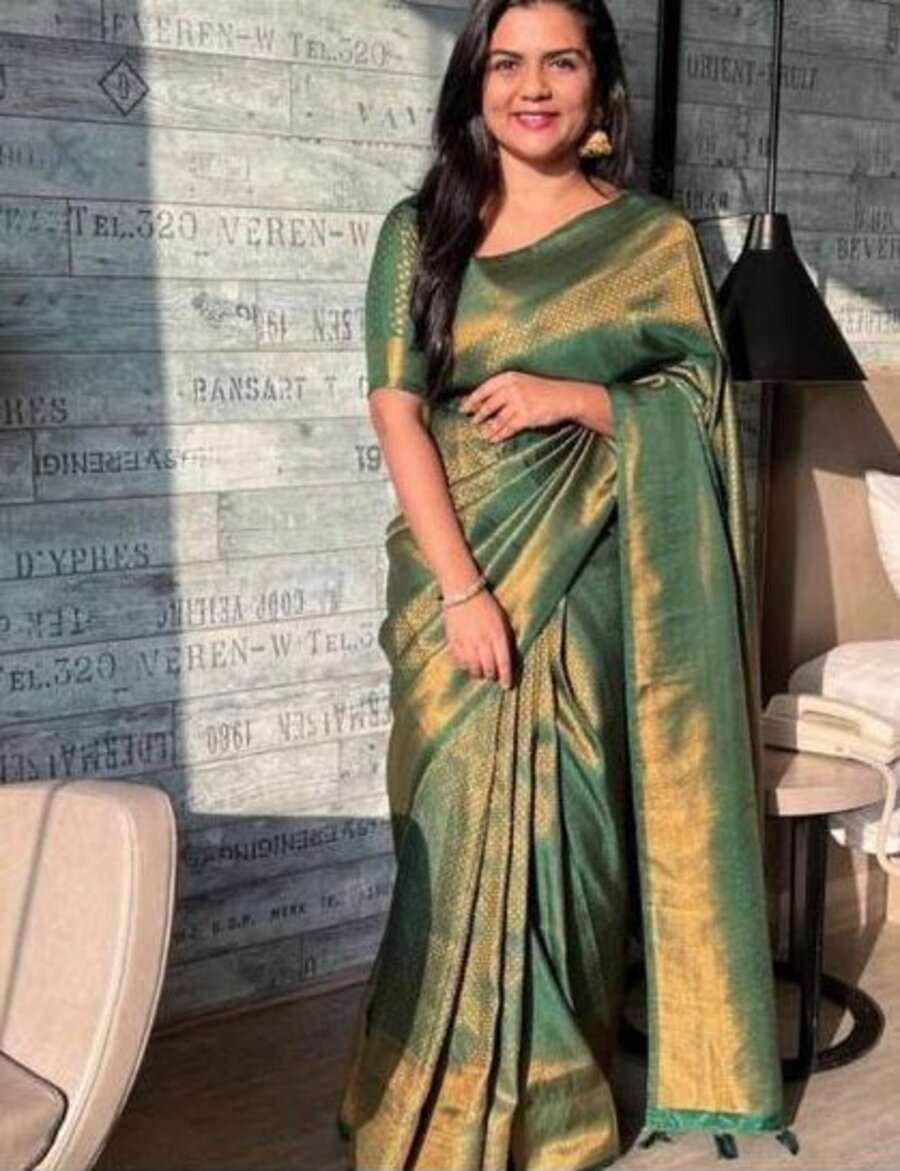 DESIGNER SOFT LICHI SILK JACQUARD WORK SAREE WITH UNSTITCHED BLOUSE GREEN