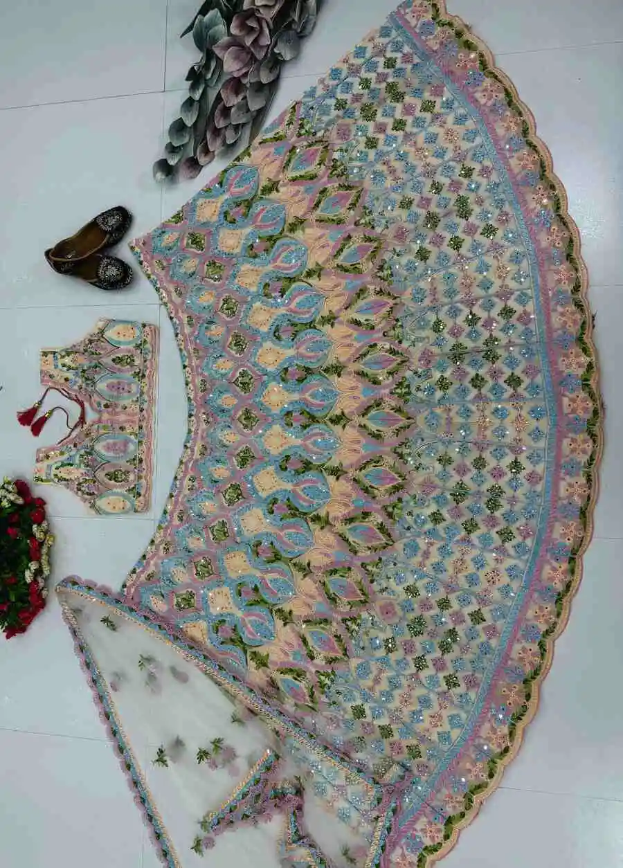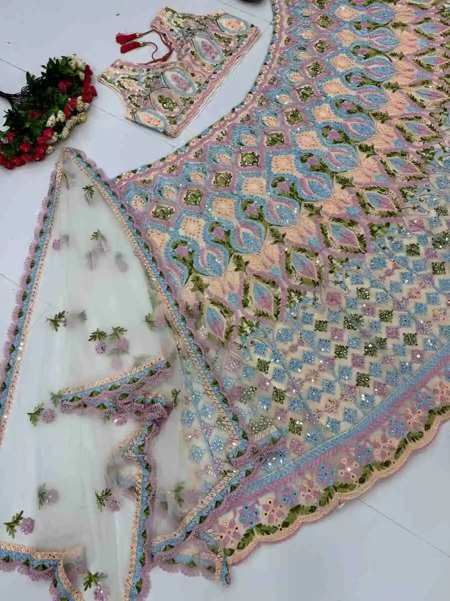 DESIGNER SOFT NET EMBROIDERY CHAIN STITCHED WITH REAL MIRROR HAND WORK LEHENGA CHOLI WITH DUPATTA MULTI