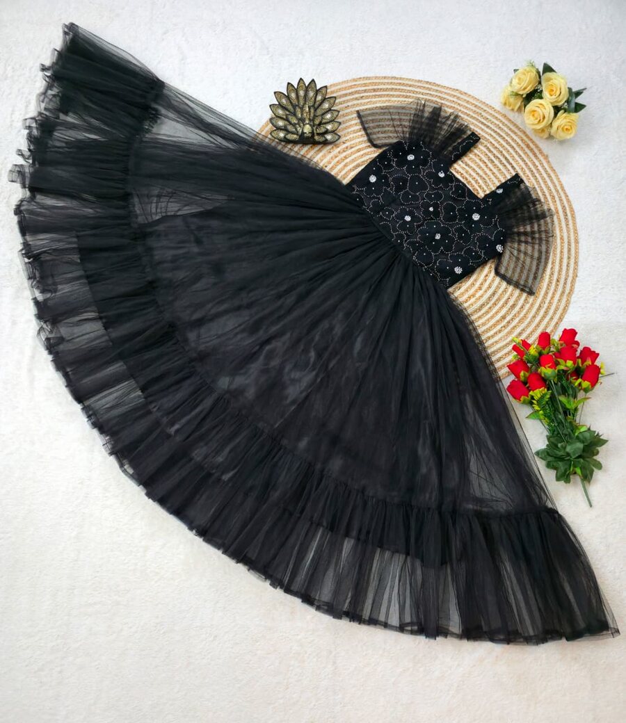 DESIGNER SOFT NET FABRIC WITH DESIGNER NET WORK MIDI DRESS BLACK