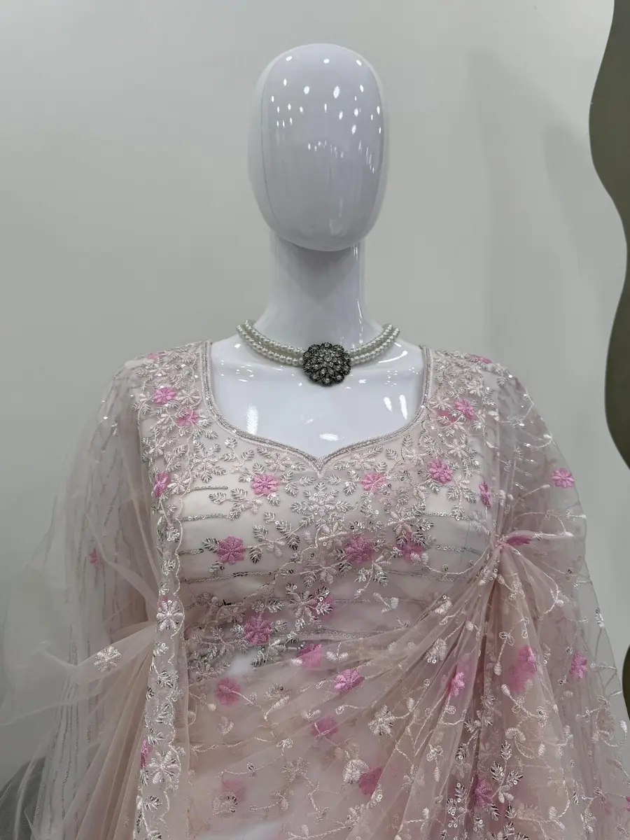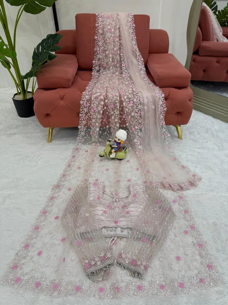 DESIGNER SOFT NET THREAD WITH SEQUENCE WORK SAREE WITH UNSTITCHED BLOUSE AND DUPATTA BABY PINK
