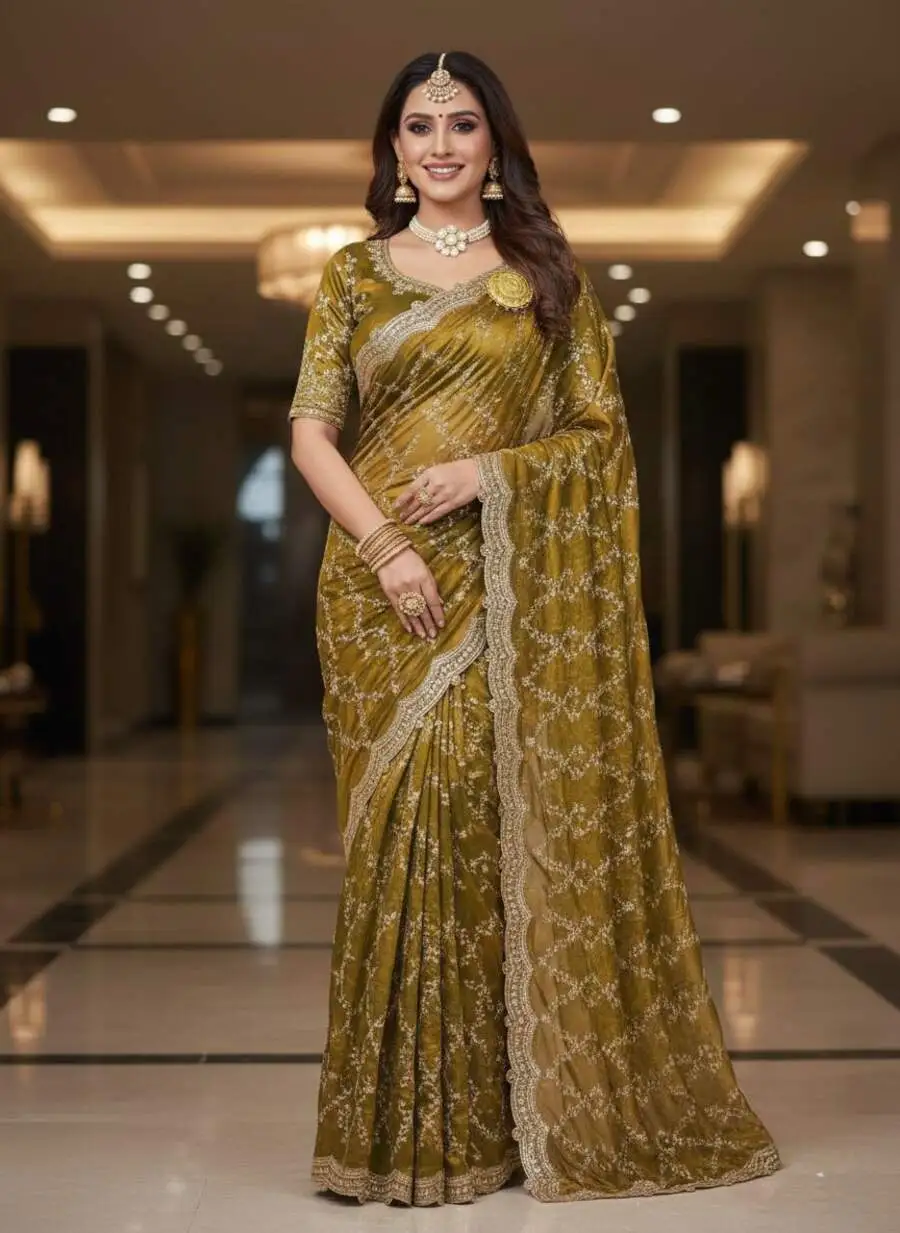 DESIGNER SPACE SILK CUT WORK AND RICH FLOWER SEQUENCE EMBRODERY WORK SAREE WITH UNSTITCHED BLOUSE MUSTARD