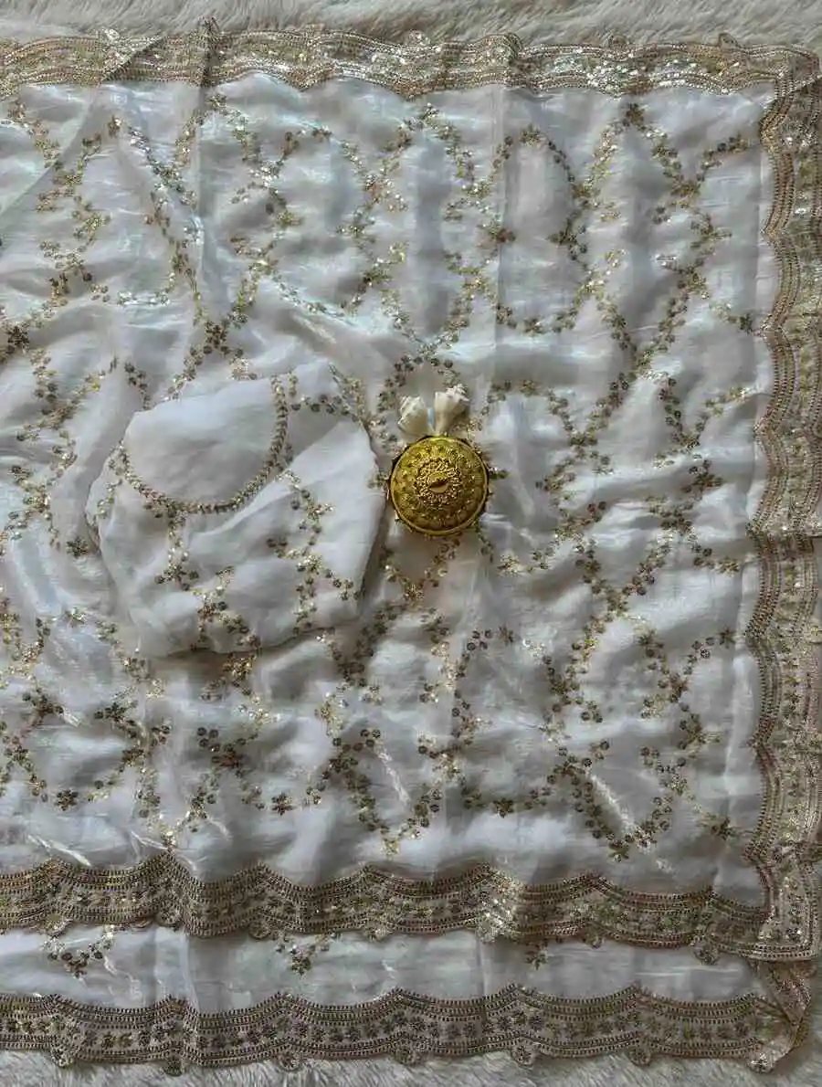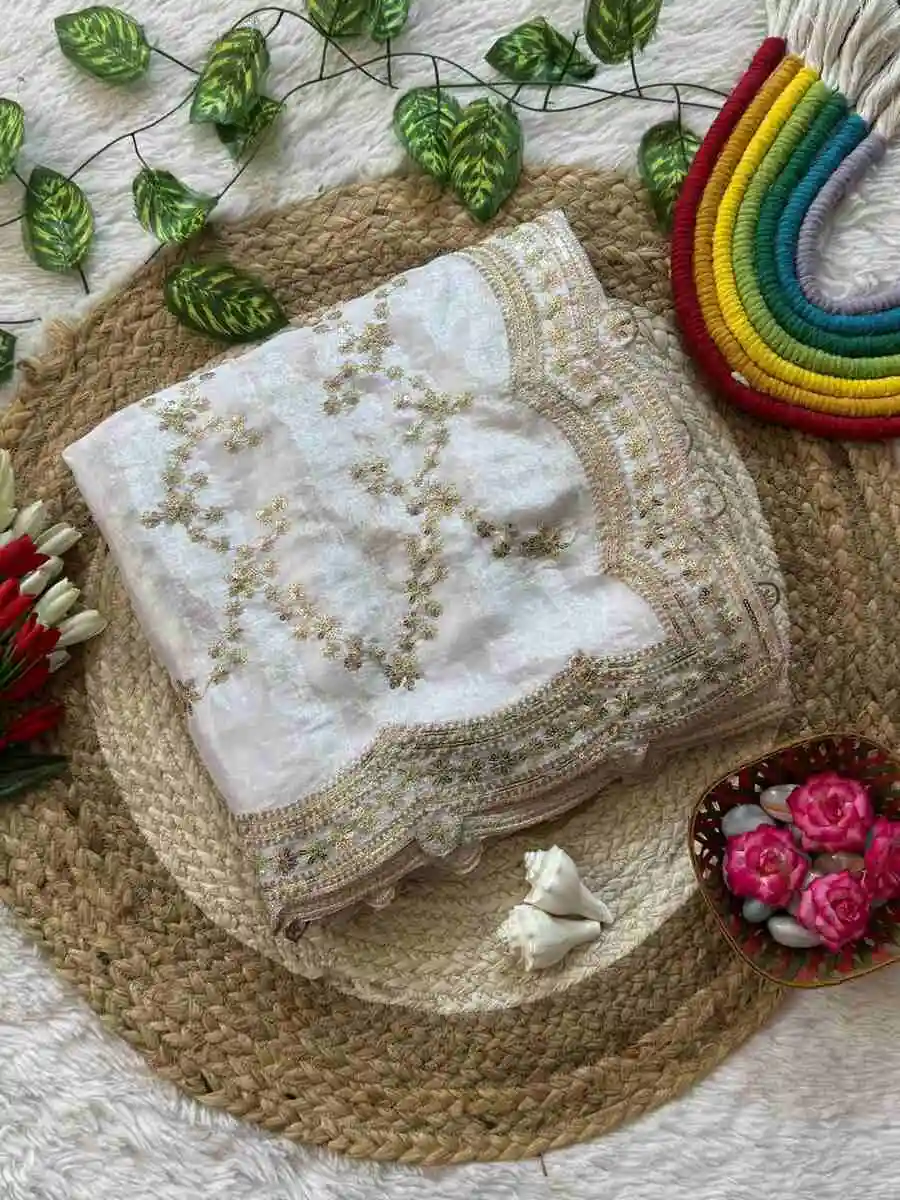 DESIGNER SPACE SILK CUT WORK AND RICH FLOWER SEQUENCE EMBRODERY WORK SAREE WITH UNSTITCHED BLOUSE WHITE