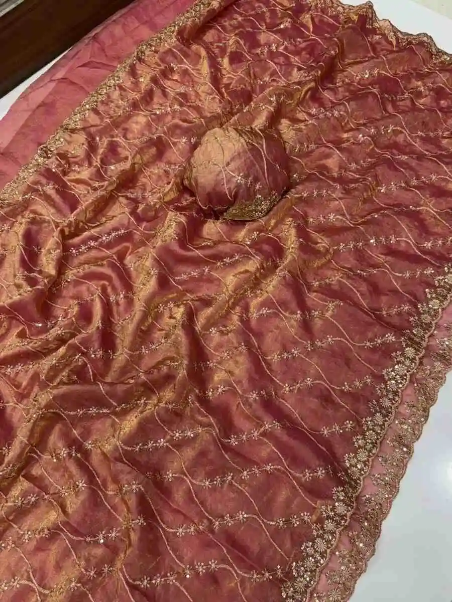 SAREE FABRIC : PREMIUM DIAMOND CHINON SILK WITH HEAVY EMBROIDERY CODING MULTI TREADS AND SEQUENCE WORK