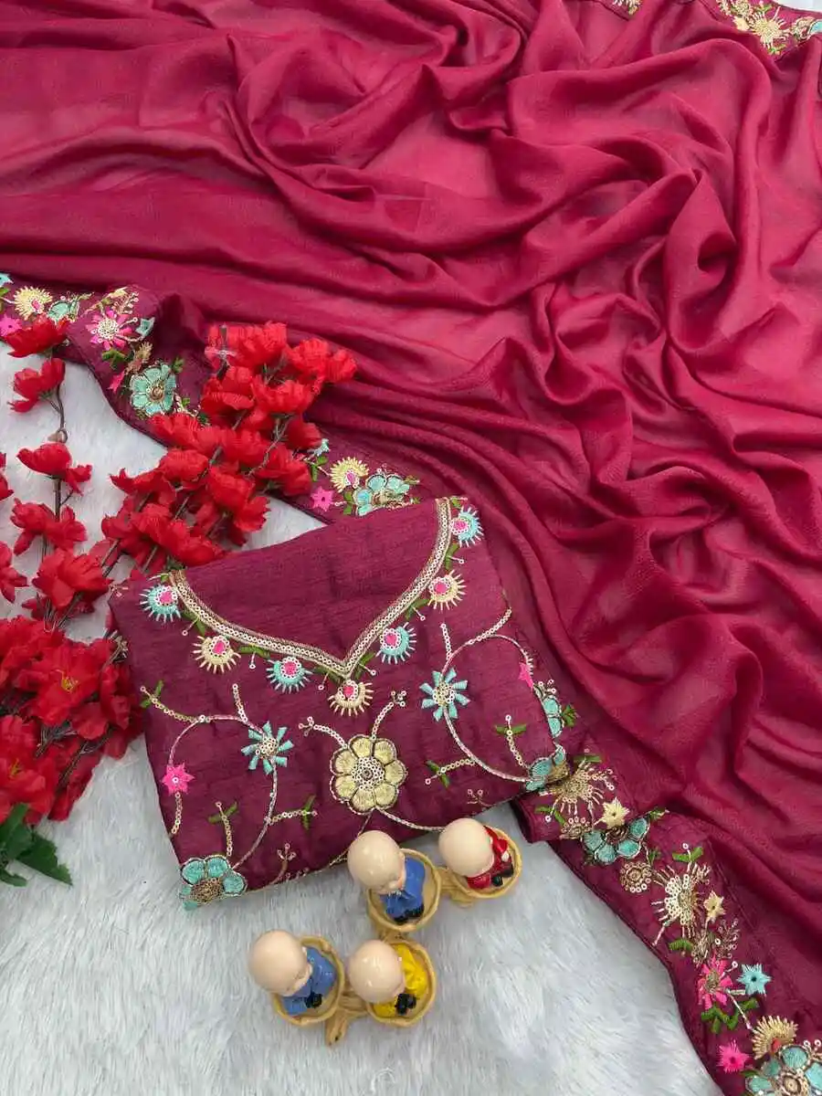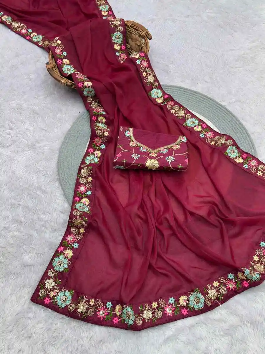 DESIGNER STAR GEORGETTE VAL SEQUENCE EMBROIDERY LACE WORK SAREE WITH UNSTITCHED BLOUSE MAROON