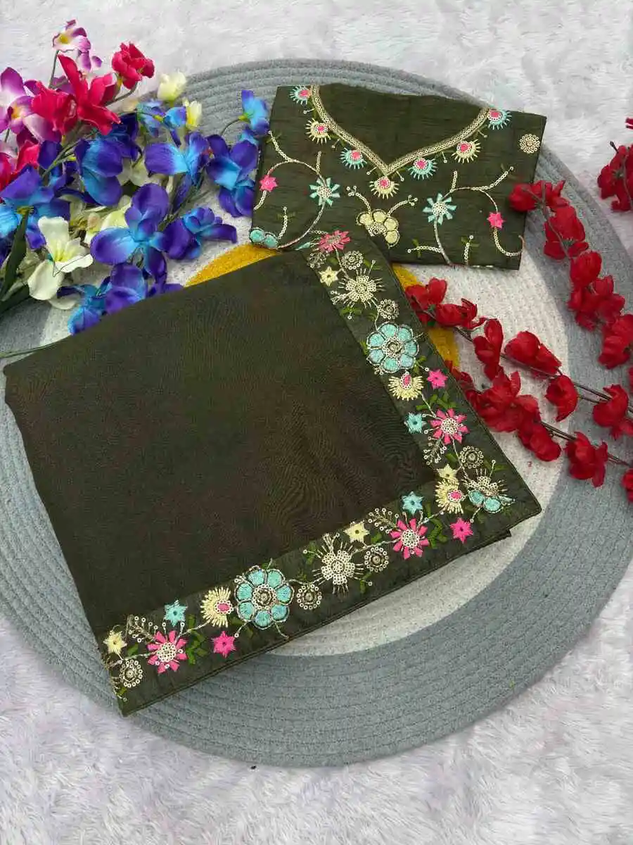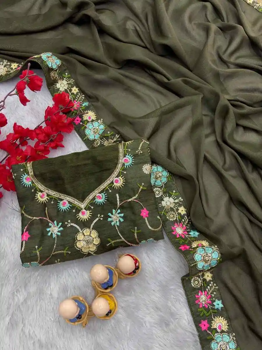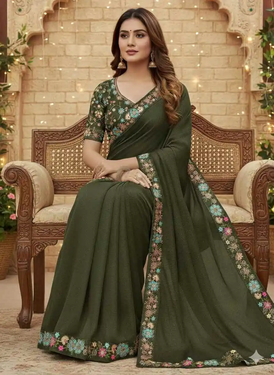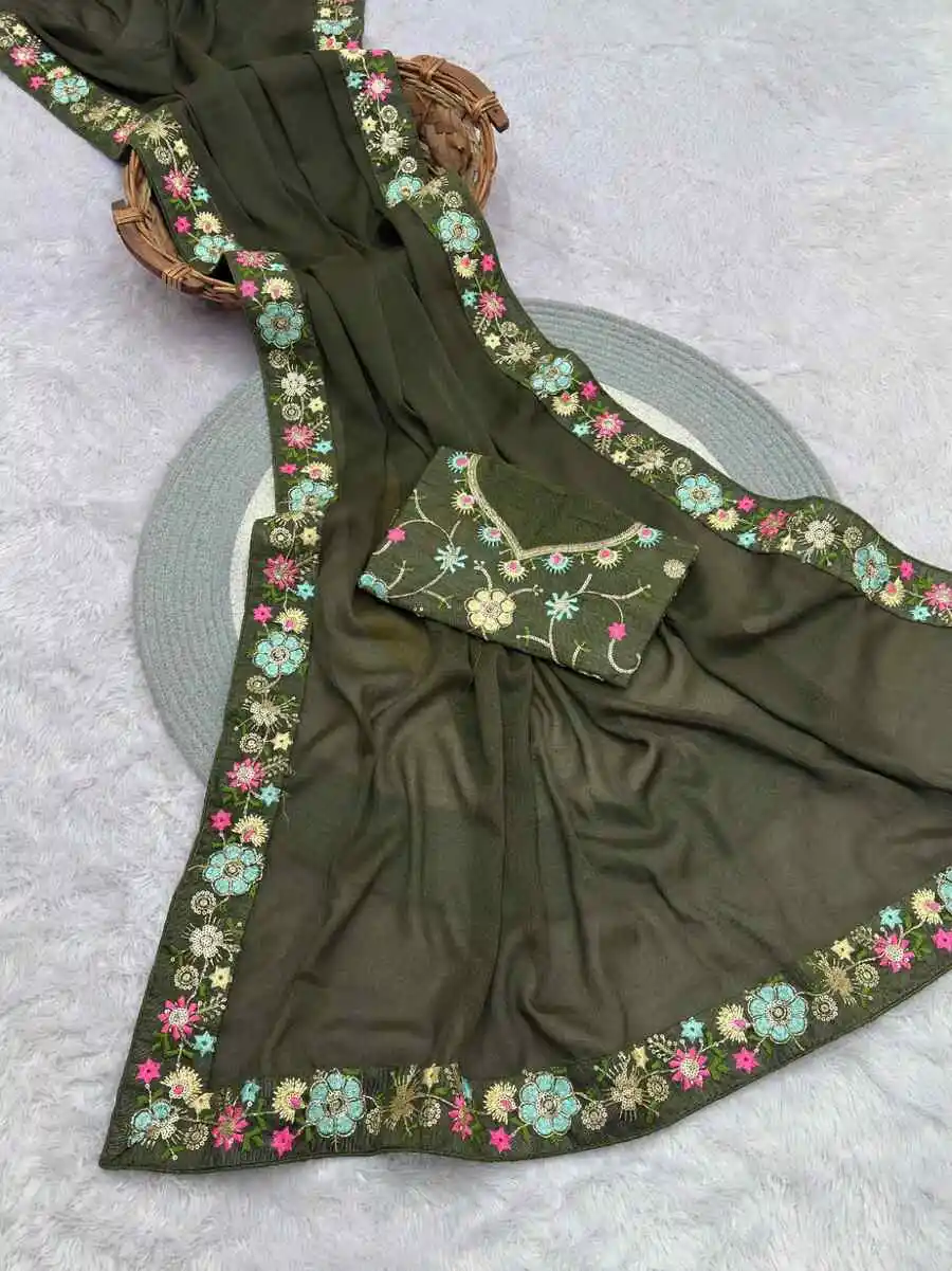 DESIGNER STAR GEORGETTE VAL SEQUENCE EMBROIDERY LACE WORK SAREE WITH UNSTITCHED BLOUSE MEHNDI