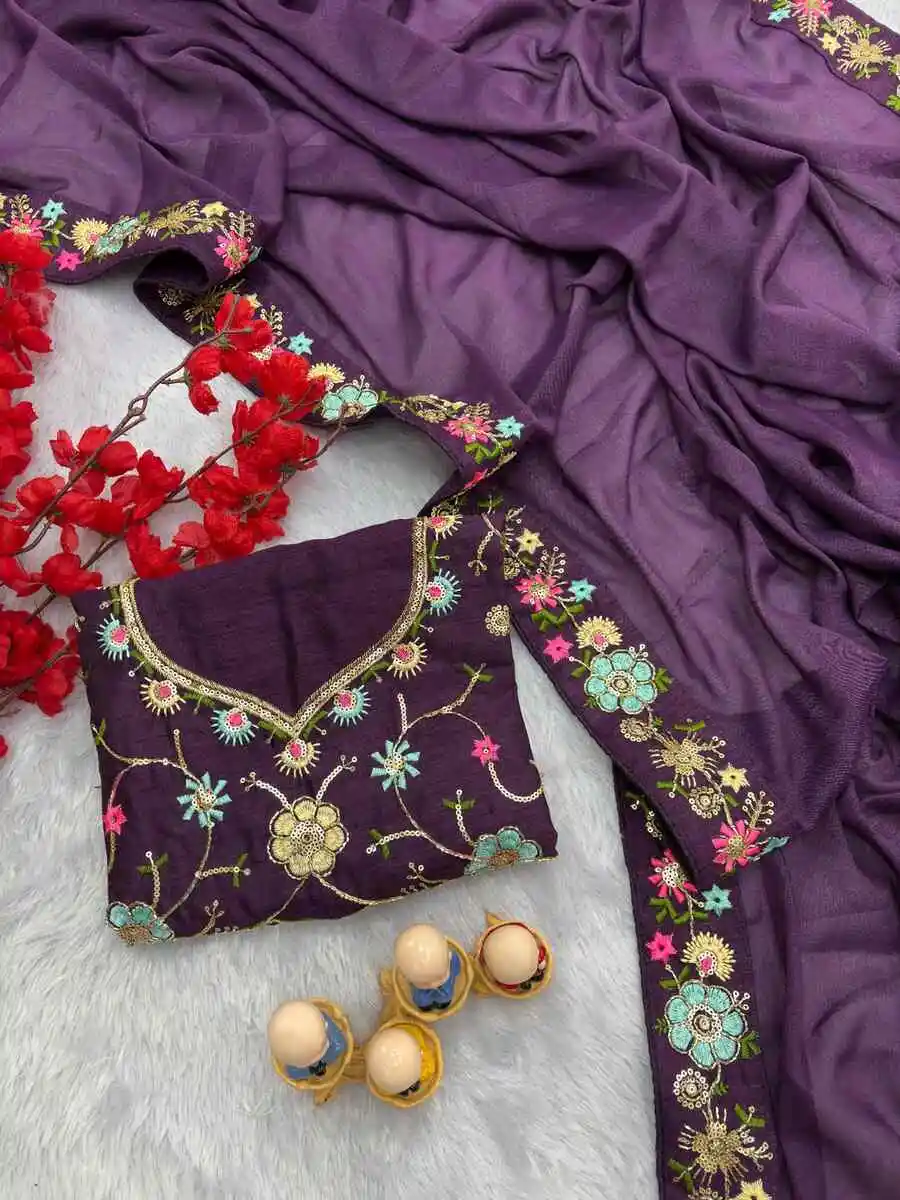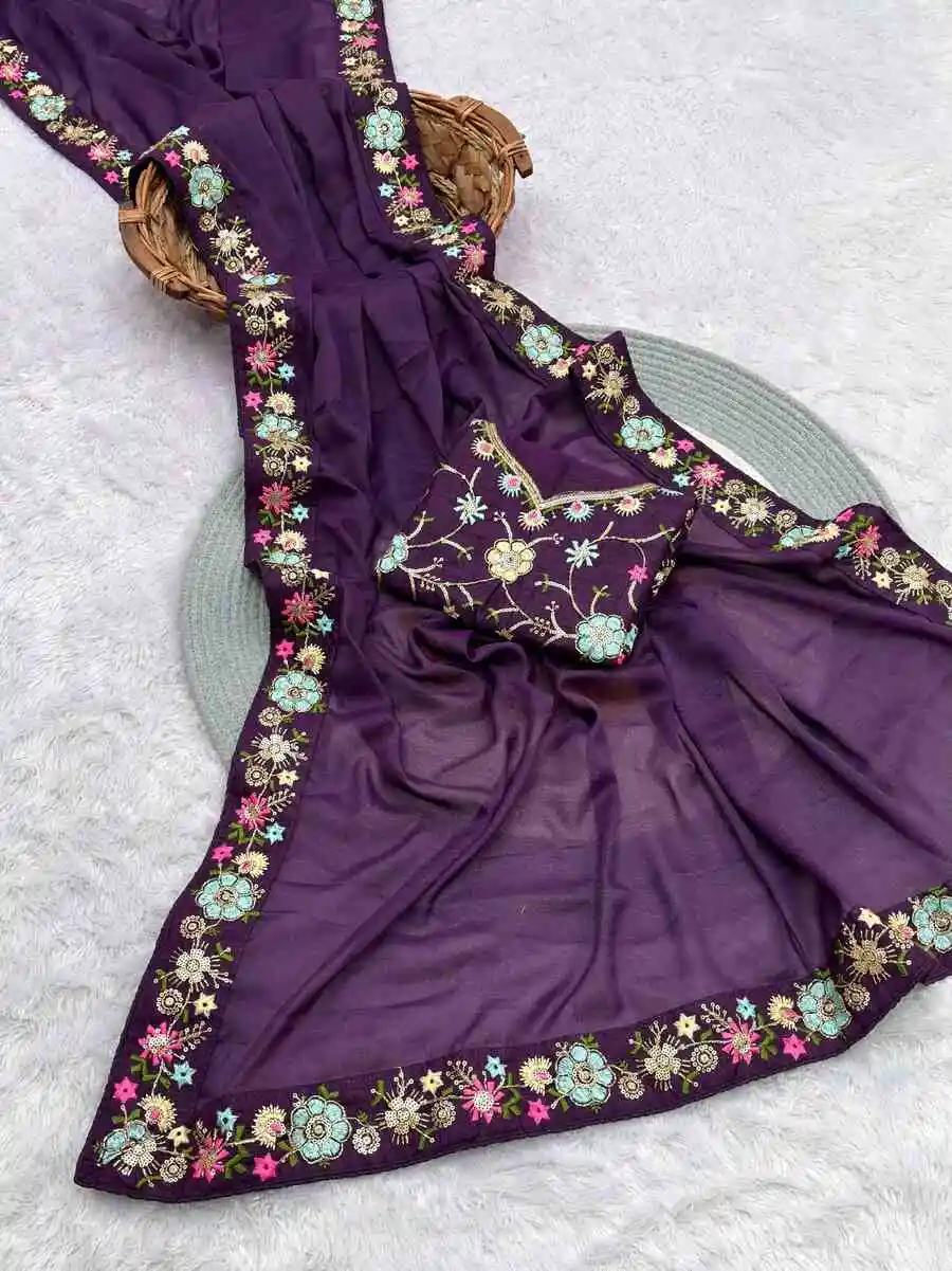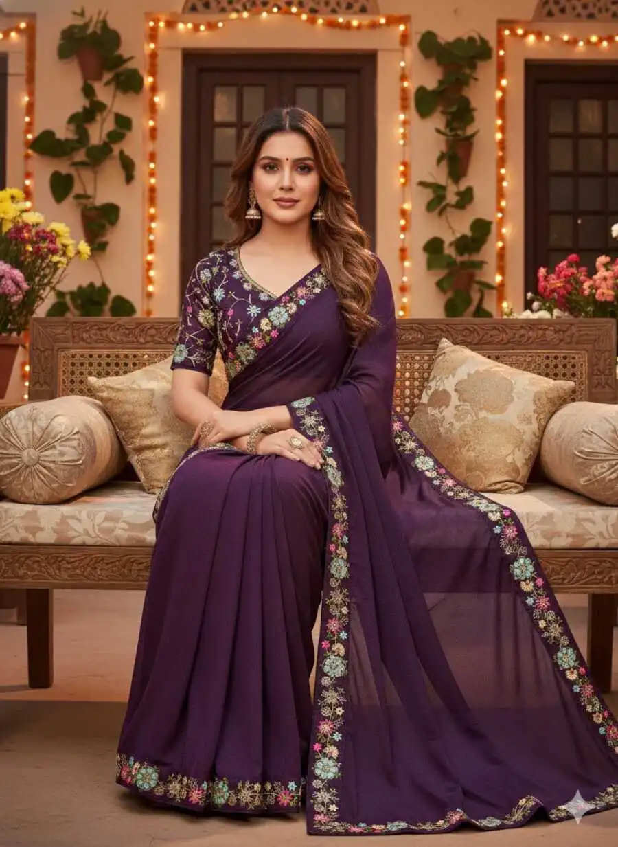 DESIGNER STAR GEORGETTE VAL SEQUENCE EMBROIDERY LACE WORK SAREE WITH UNSTITCHED BLOUSE PURPLE