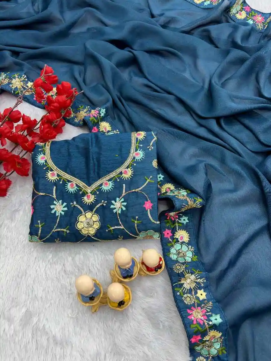 SAREE FABRIC : PREMIUM DIAMOND CHINON SILK WITH HEAVY EMBROIDERY CODING MULTI TREAD & SEQUENCE WORK WITH PIPING BORDER