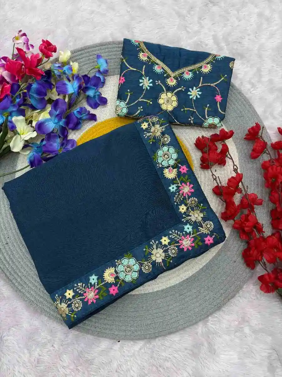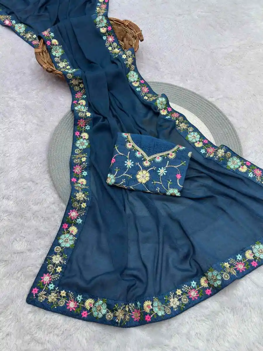 SAREE FABRIC :- PREMIUM GEORGETTE WITH ALL OVER SEQUENCE AND THREAD WORK AND BORDER IN EMBROIDERY CODING AND SEQUENCE WORK WITH FANCY CUT WORK