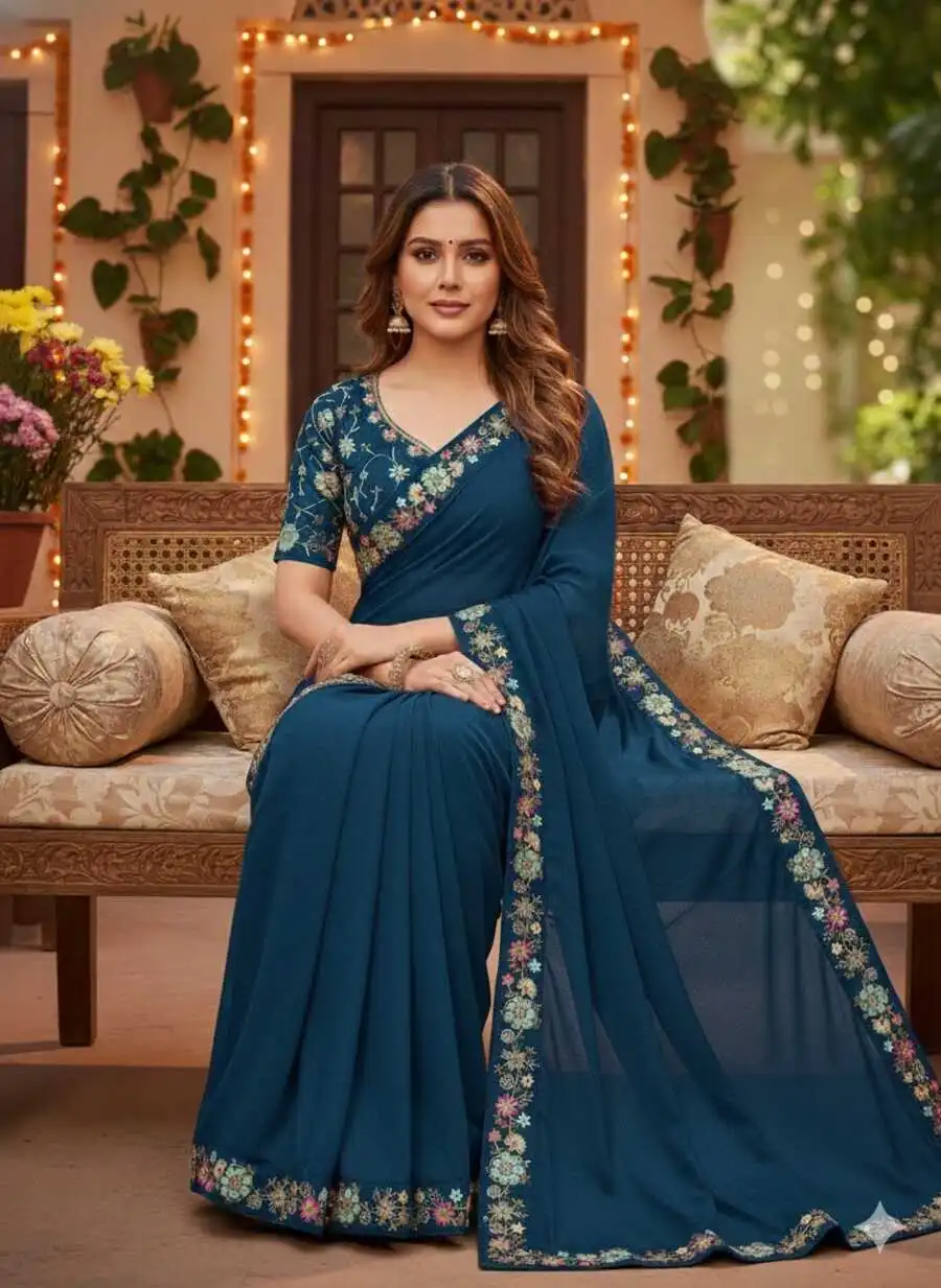 DESIGNER STAR GEORGETTE VAL SEQUENCE EMBROIDERY LACE WORK SAREE WITH UNSTITCHED BLOUSE TEAL