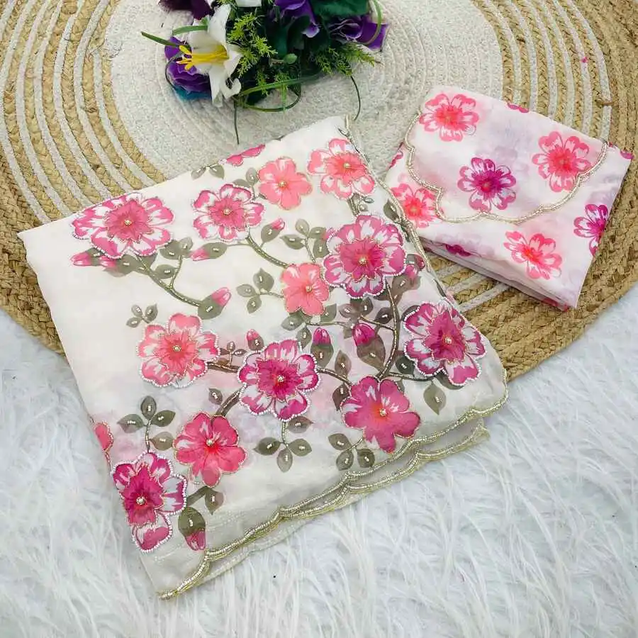 DESIGNER TABBY ORGANZA FLORAL PRINTS WITH BEADS AND CUT DANA HANDWORK SAREE WITH UNSTITCHED BLOUSE PINK