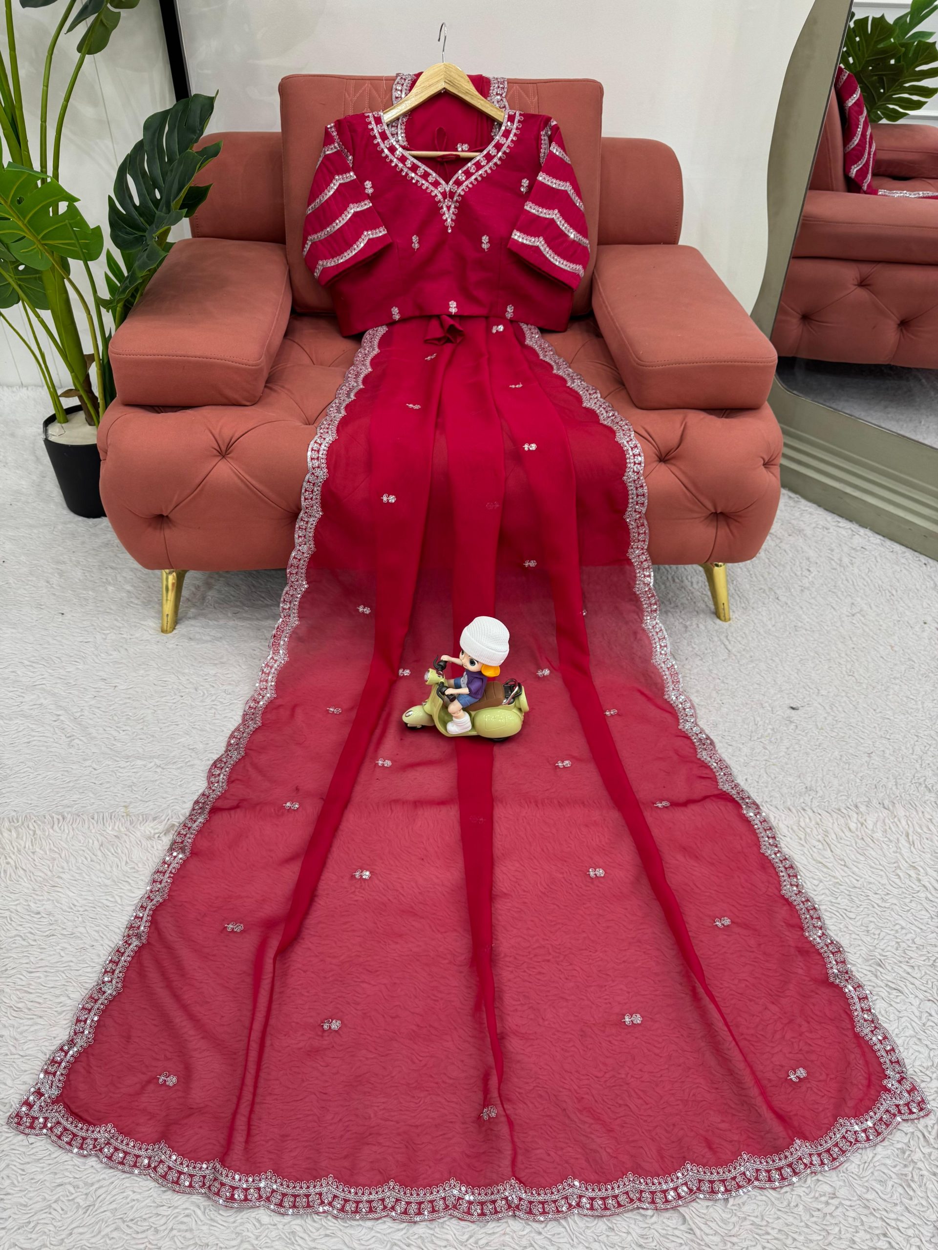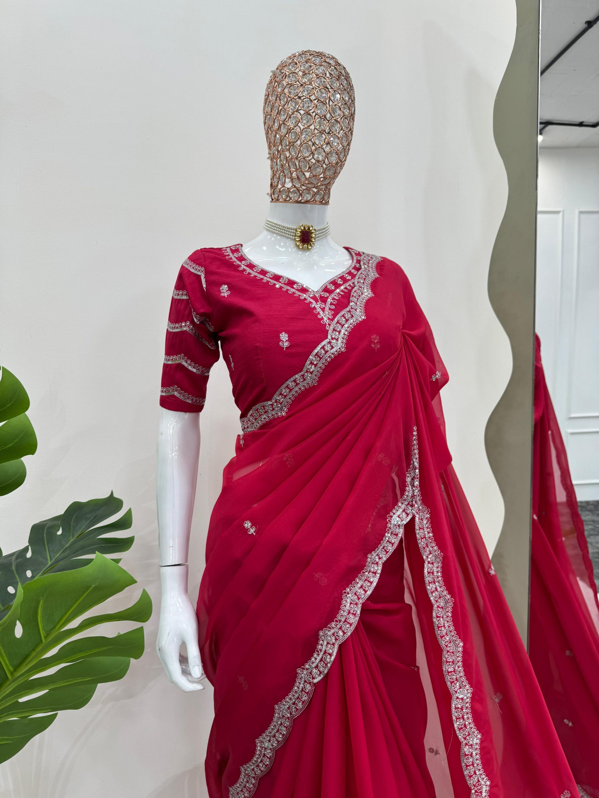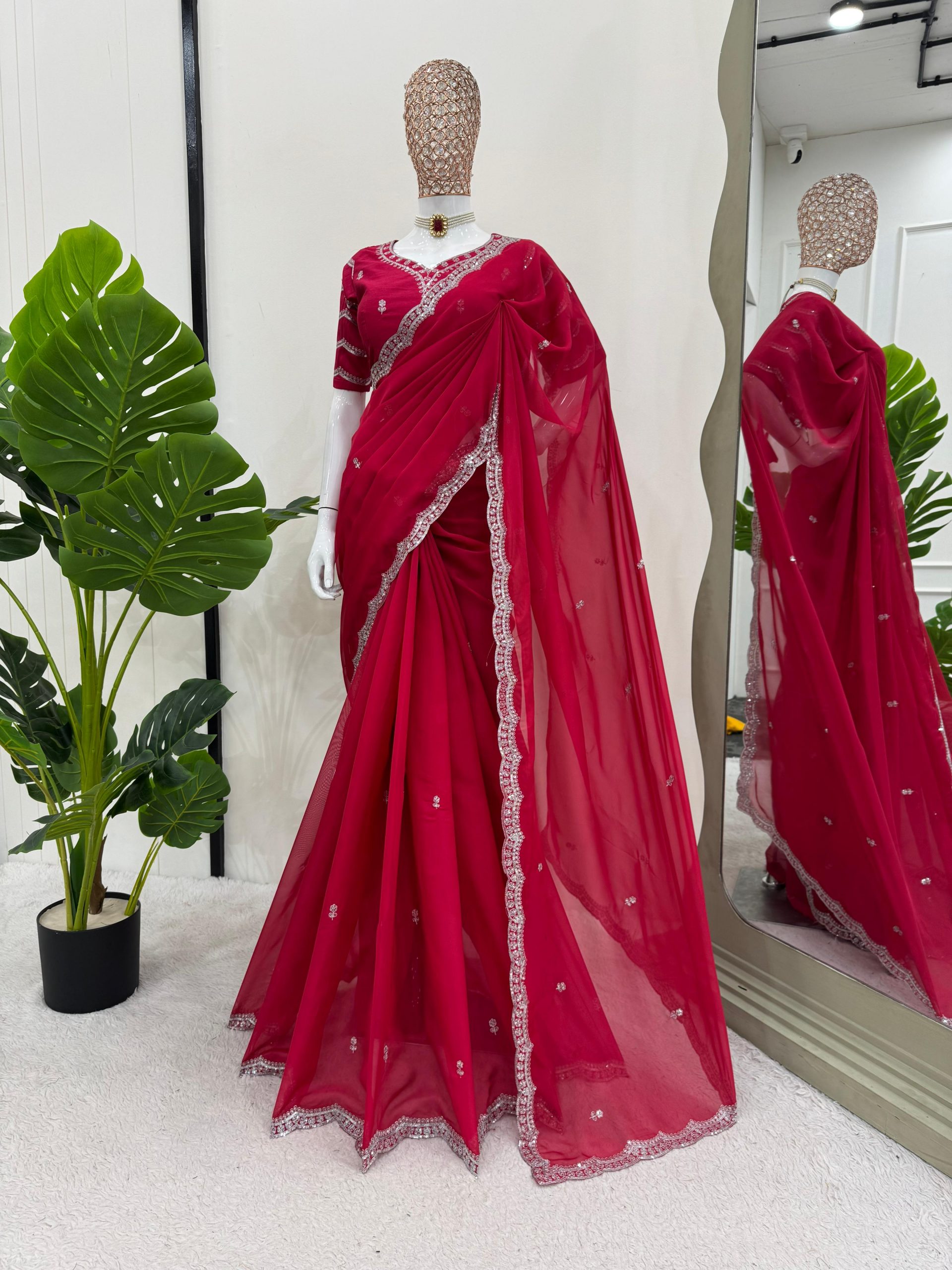 SAREE FABRIC : PREMIUM DIAMOND CHINON SILK WITH HEAVY EMBROIDERY CODING MULTI TREAD & SEQUENCE WORK WITH PIPING BORDER