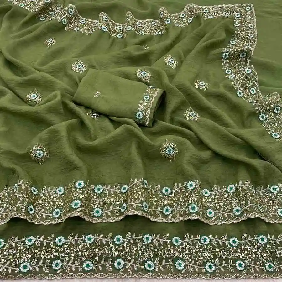 DESIGNER TISSUE CRUSH EMBROIDERY 3+5(DUAL) MM SEQUENCE WORK HEAVY BORDER WITH BUTTI WORK SAREE WITH UNSTITCHED BLOUSE MEHNDI