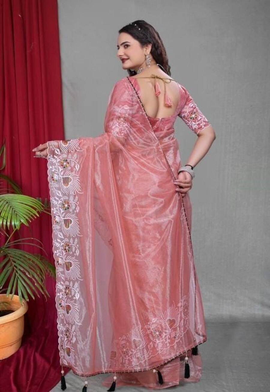 DESIGNER TWILL NET MULTI WORK SAREE WITH UNSTITCHED BLOUSE PINK