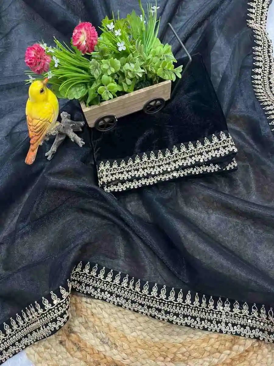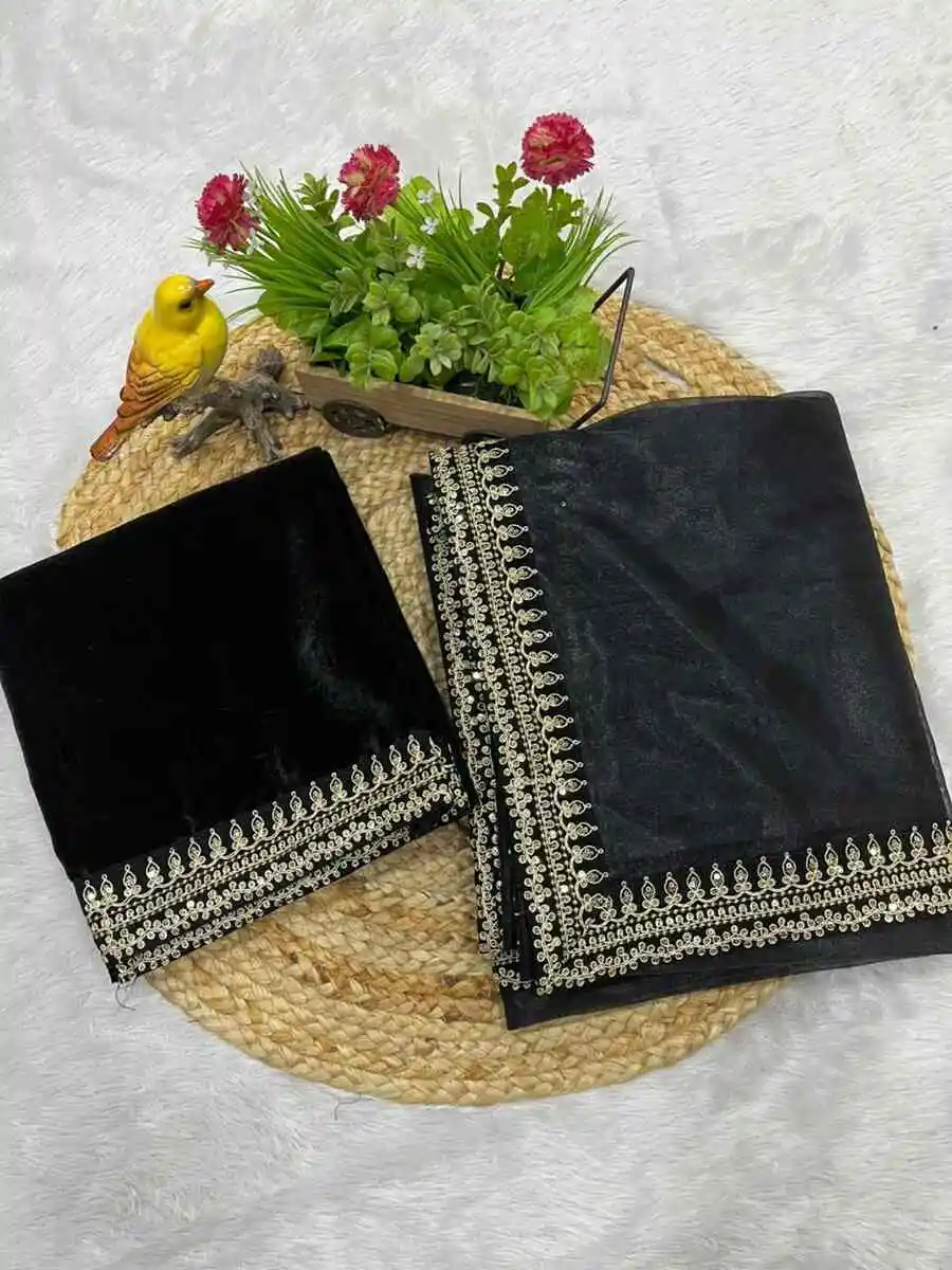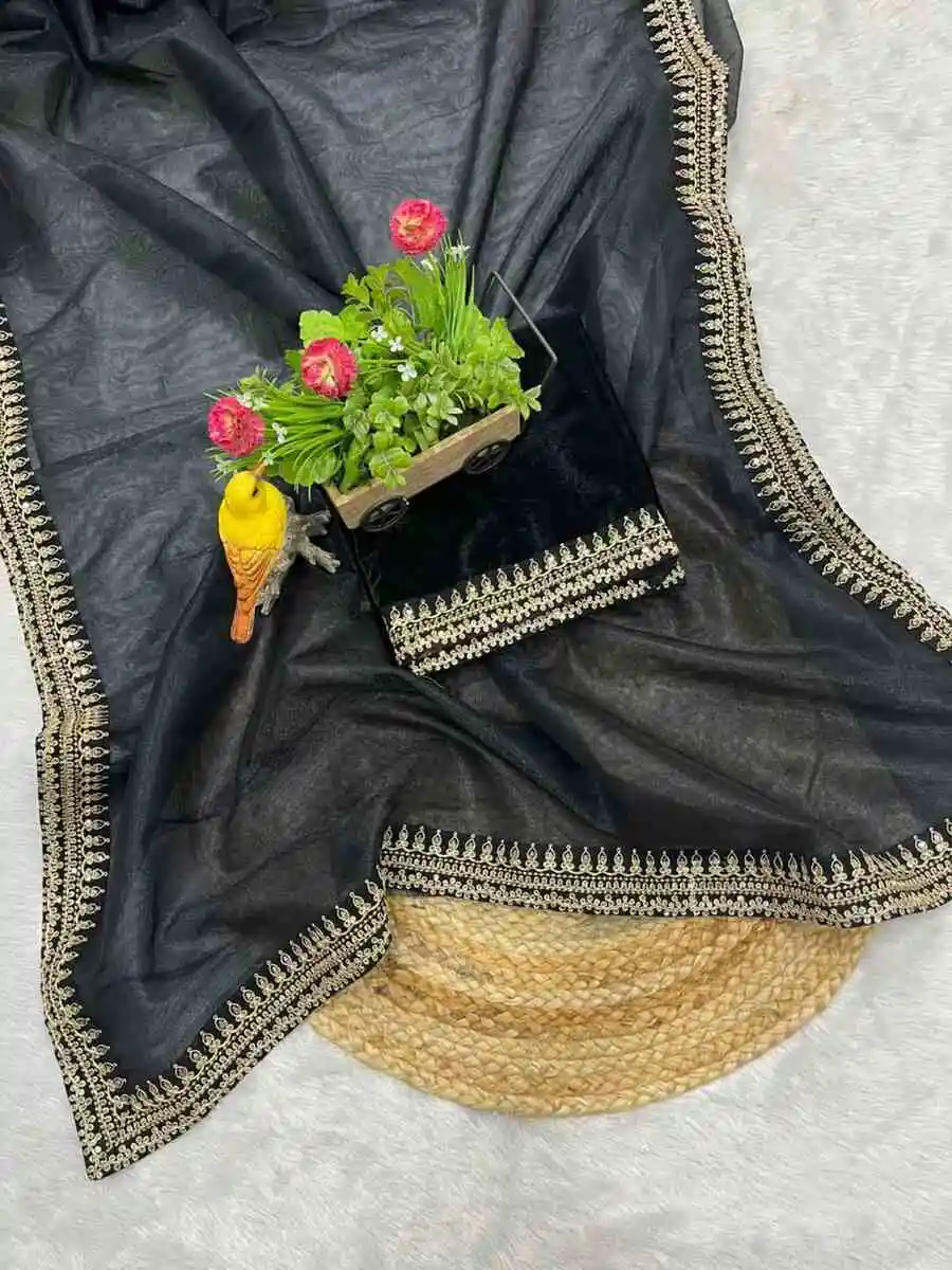 DESIGNER TWILL NET SEQUENCE WITH JARI DORI EMBROIDERY WORK VELVET LACE BORDER WORK SAREE WITH UNSTITCHED BLOUSE BLACK