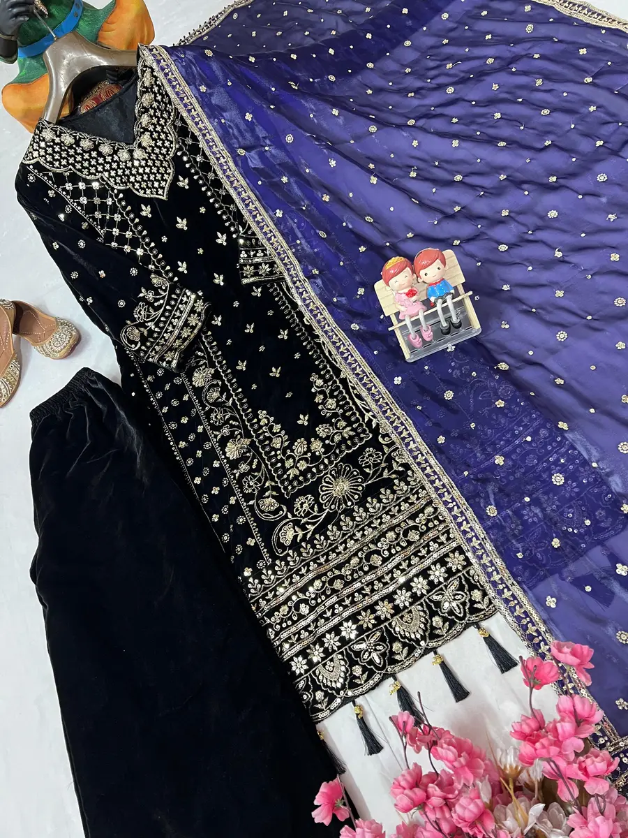 DESIGNER VELEVET SEQUENCE & ZARI EMBROIDERY WORK TOP PALAZZO WITH DUPATTA NAVY BLUE