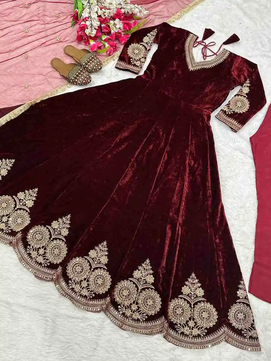 DESIGNER VELVET EMBROIDERY MULTI SEQUENCE WORK GOWN BOTTOM WITH DUPATTA MAROON