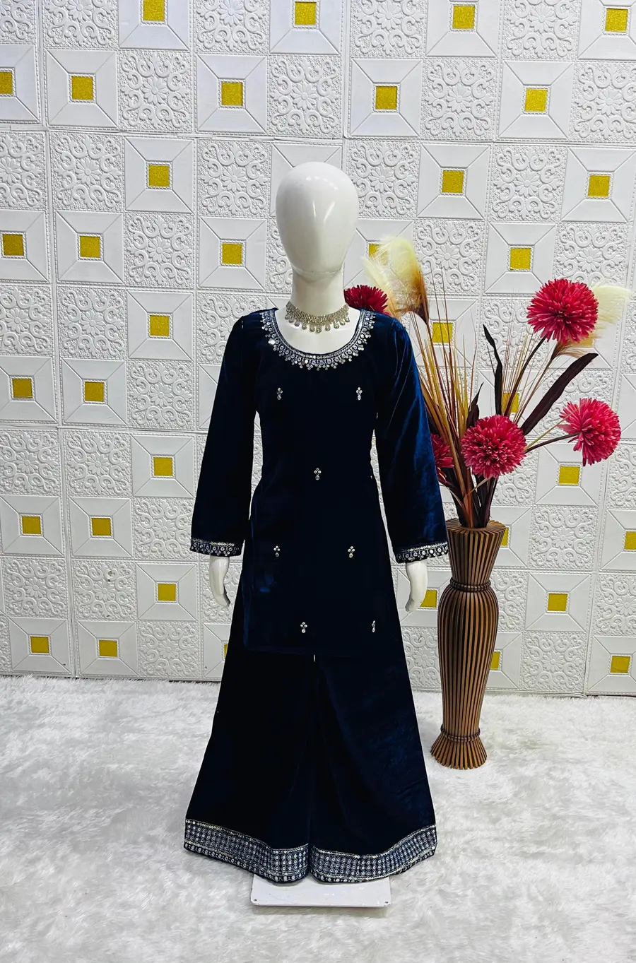 DESIGNER VELVET EMBROIDERY SEQUENCE WORK KID’S TOP PALAZZO WITH DUPATTA BLUE