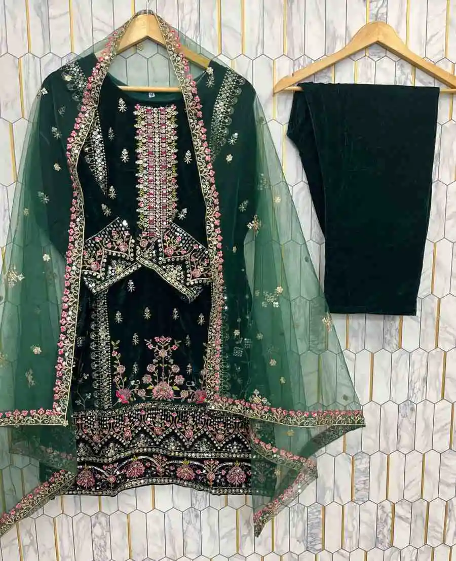 DESIGNER VELVET EMBROIDERY SEQUENCE WORK TOP BOTTOM WITH DUPATTA GREEN