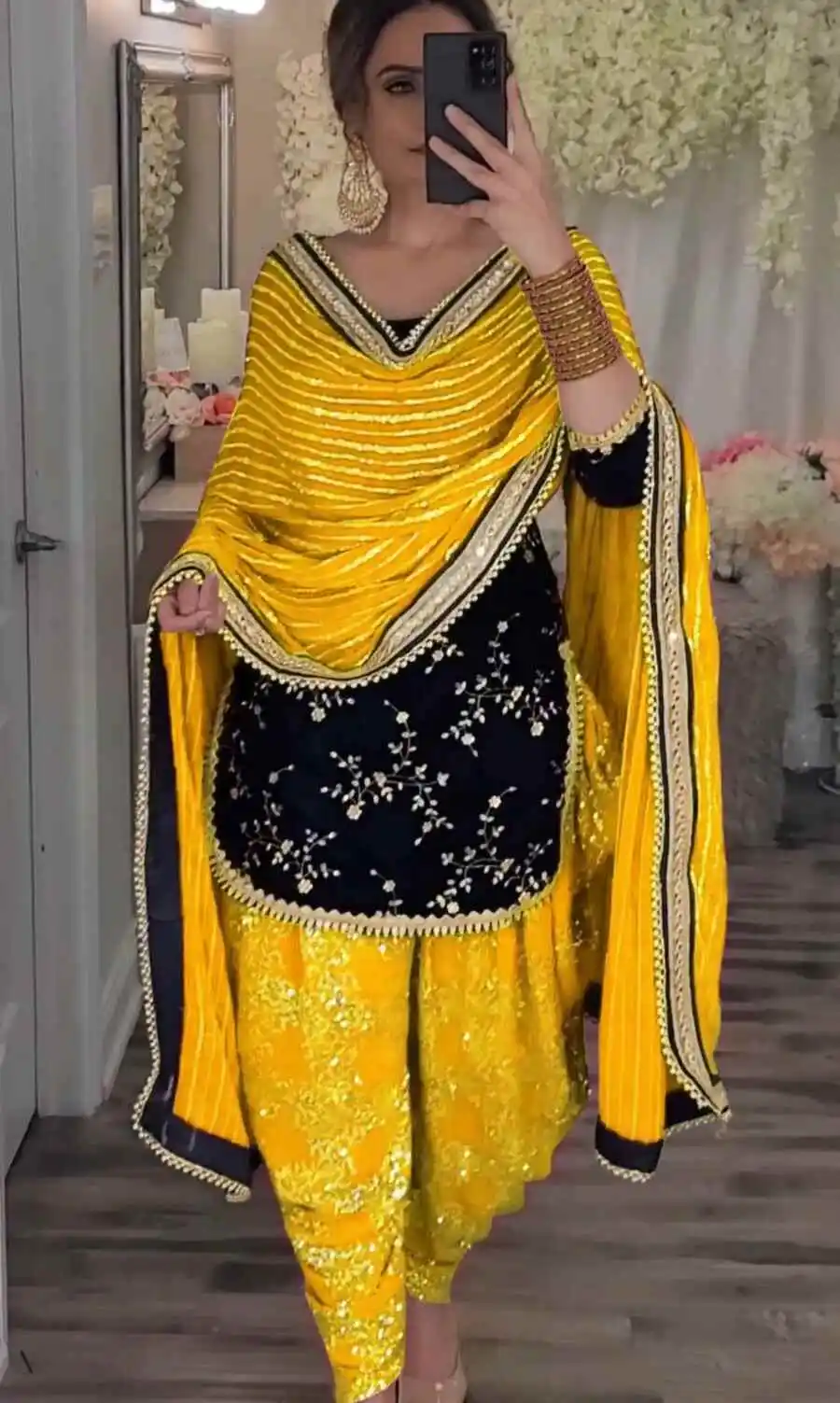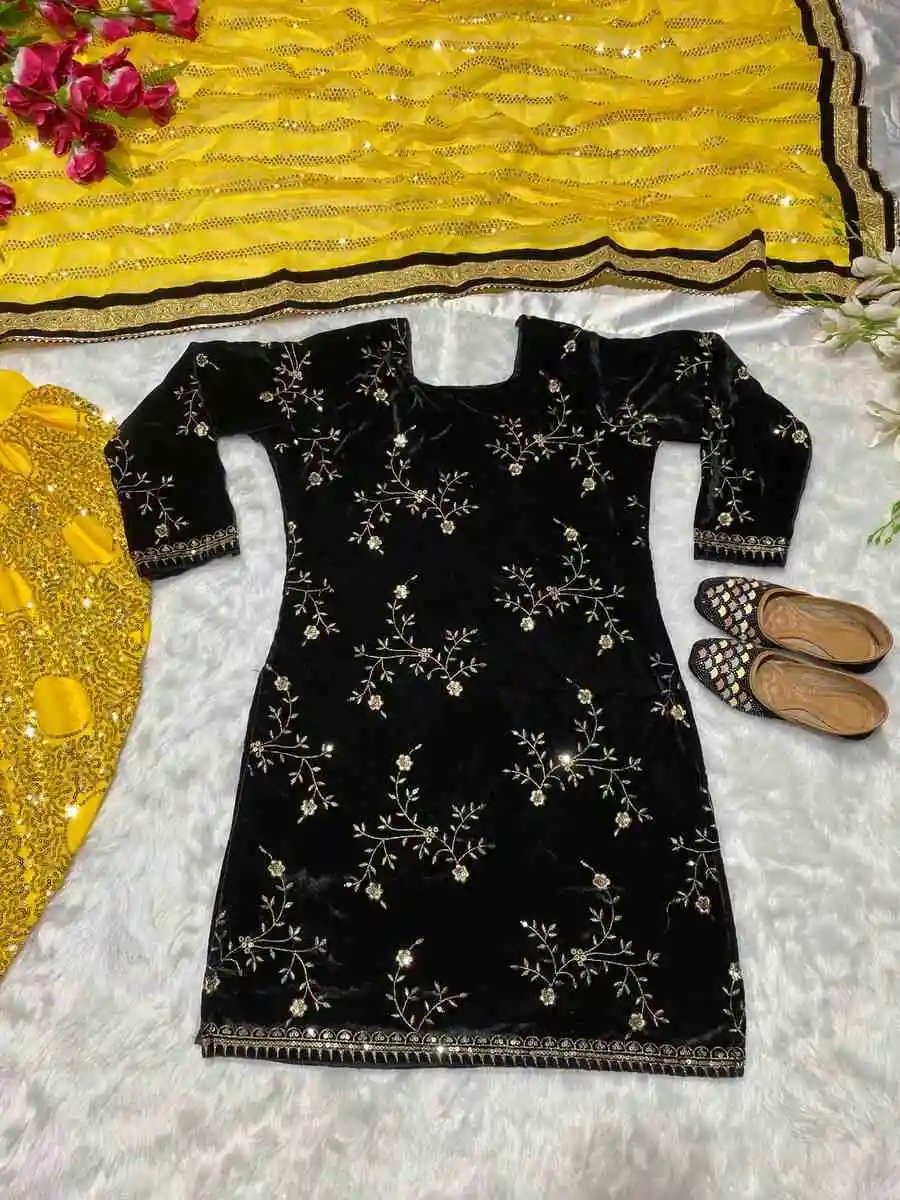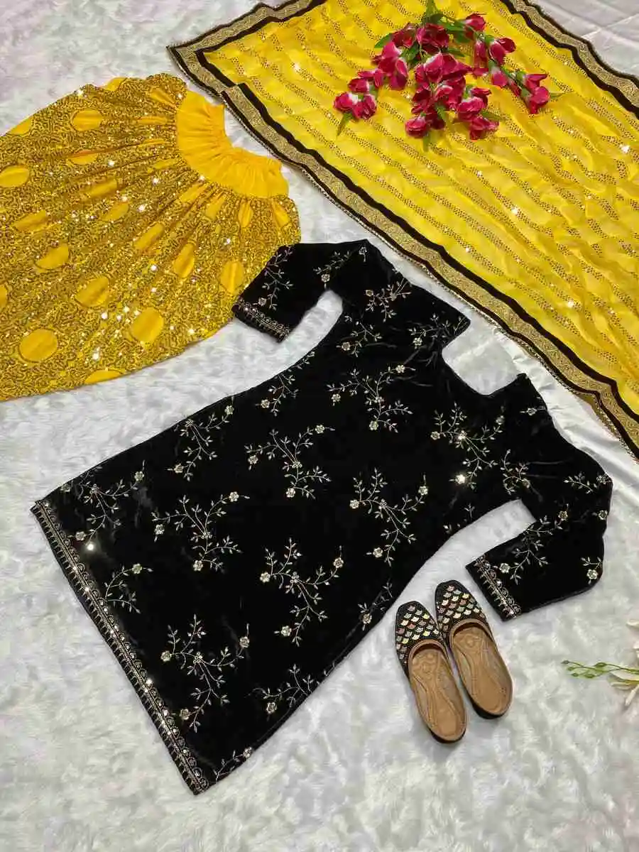 DESIGNER VELVET EMBROIDERY SEQUENCE WORK TOP DHOTI WITH DUPATTA BLACK WITH YELLOW