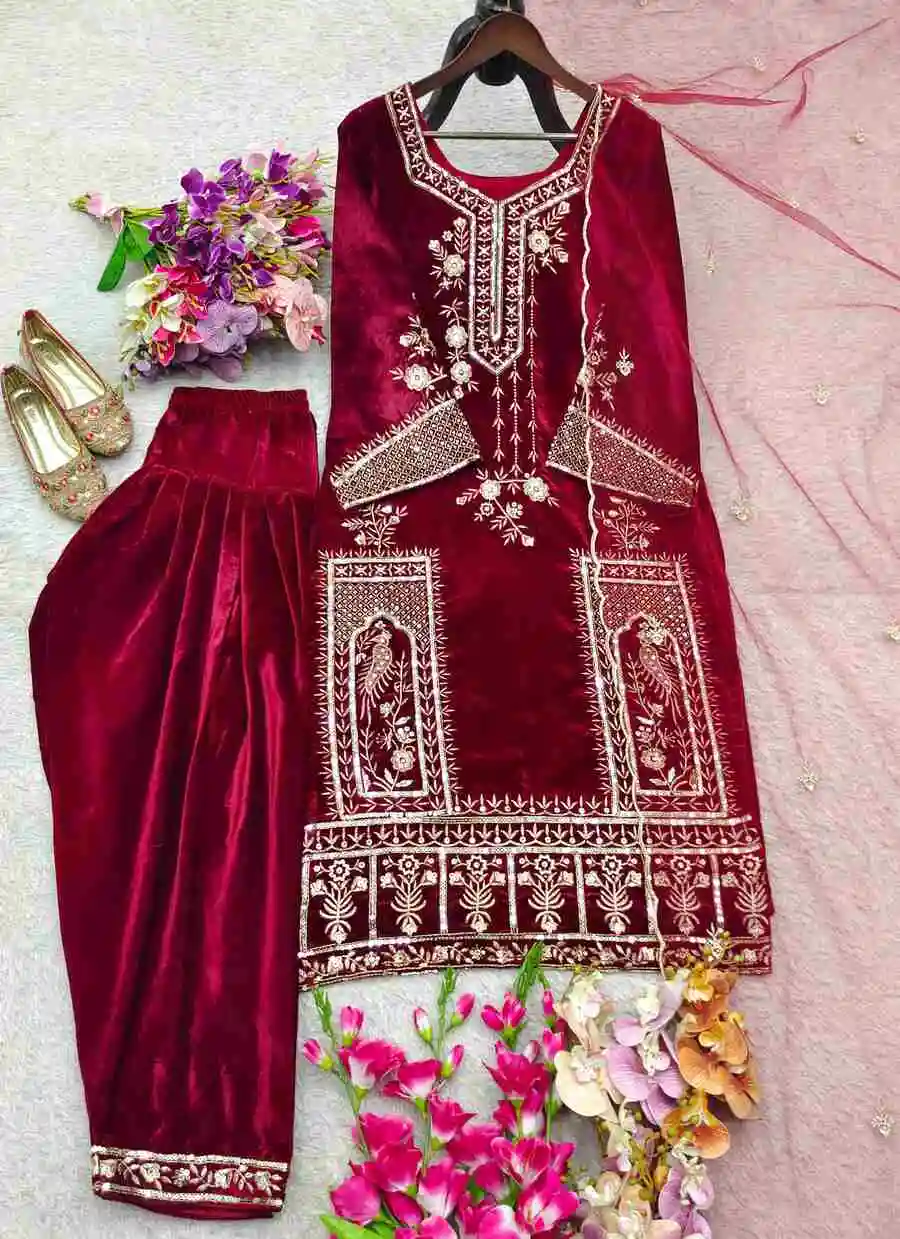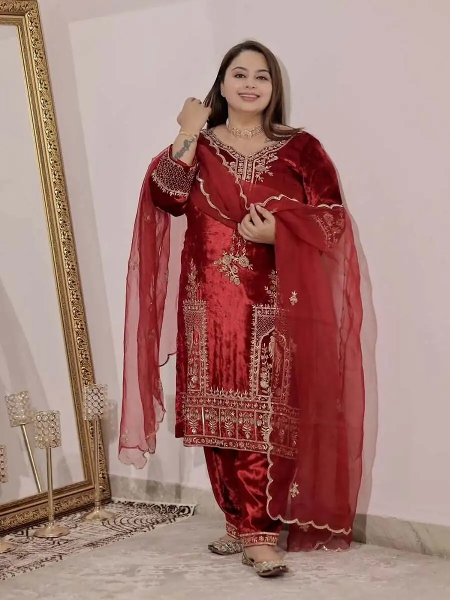 DESIGNER VELVET EMBROIDERY SEQUENCE WORK TOP PATIYALA WITH DUPATTA MAROON