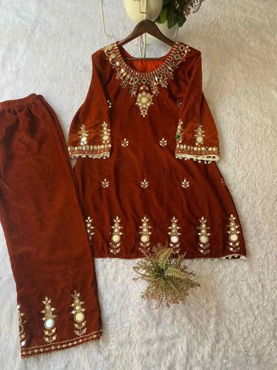DESIGNER VELVET EMBROIDERY WITH REAL MIRROR WORK CO-ORD SET ORANGE