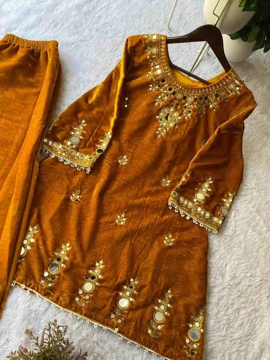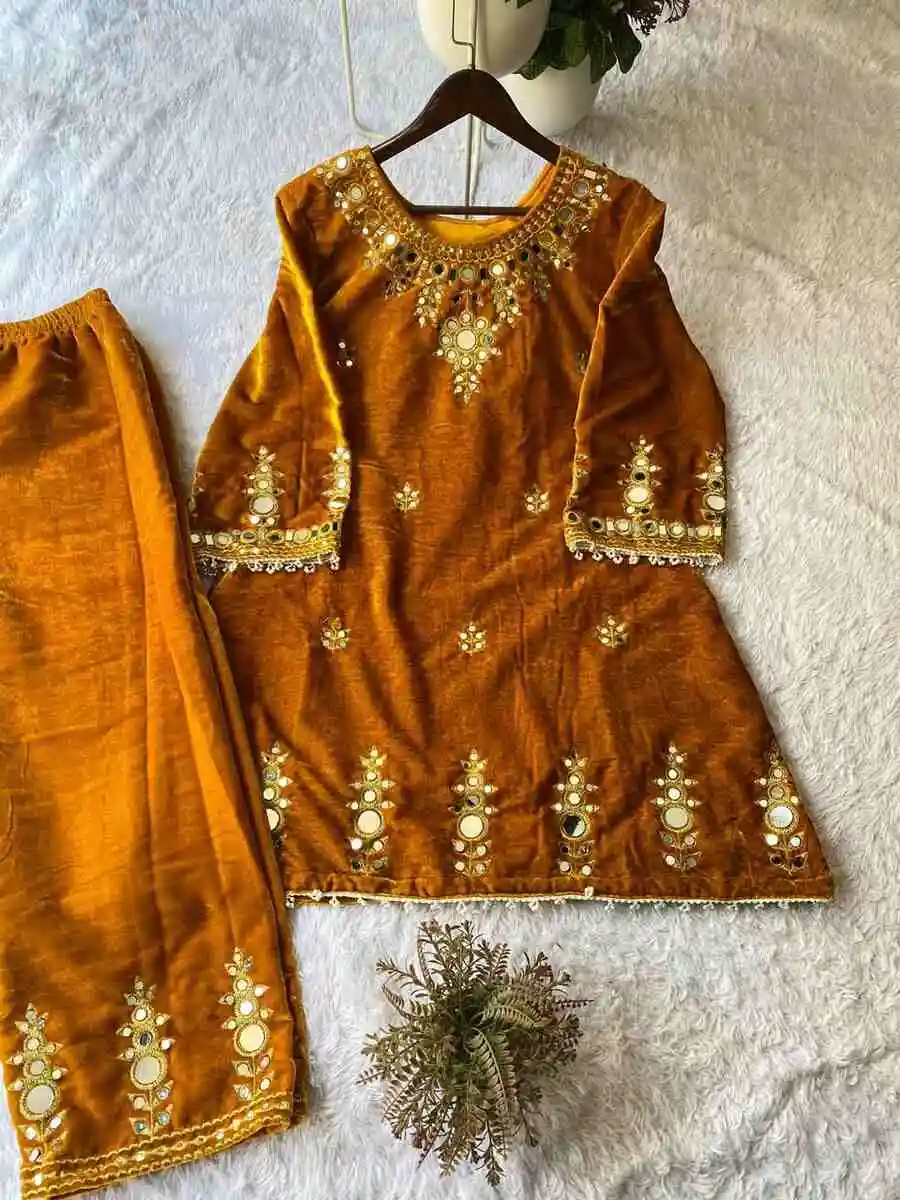 DESIGNER VELVET EMBROIDERY WITH REAL MIRROR WORK CO-ORD SET YELLOW