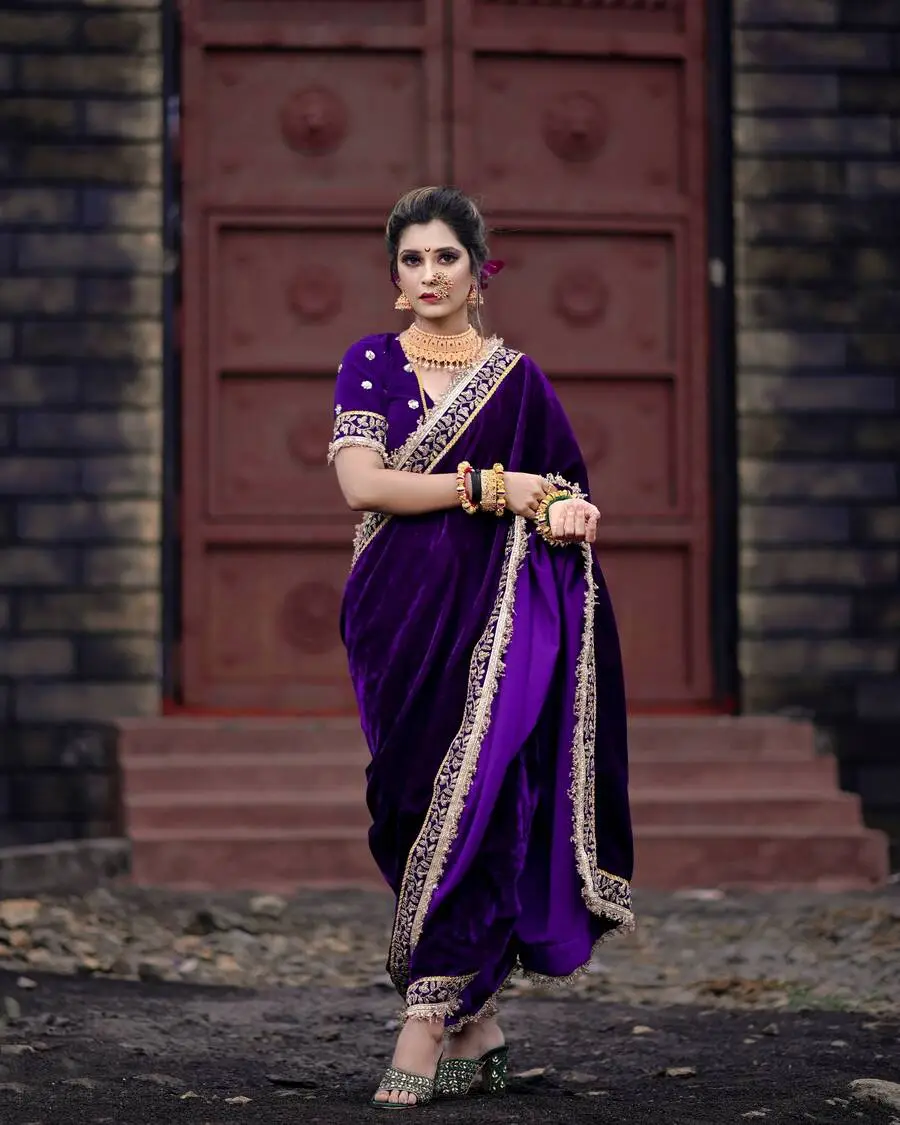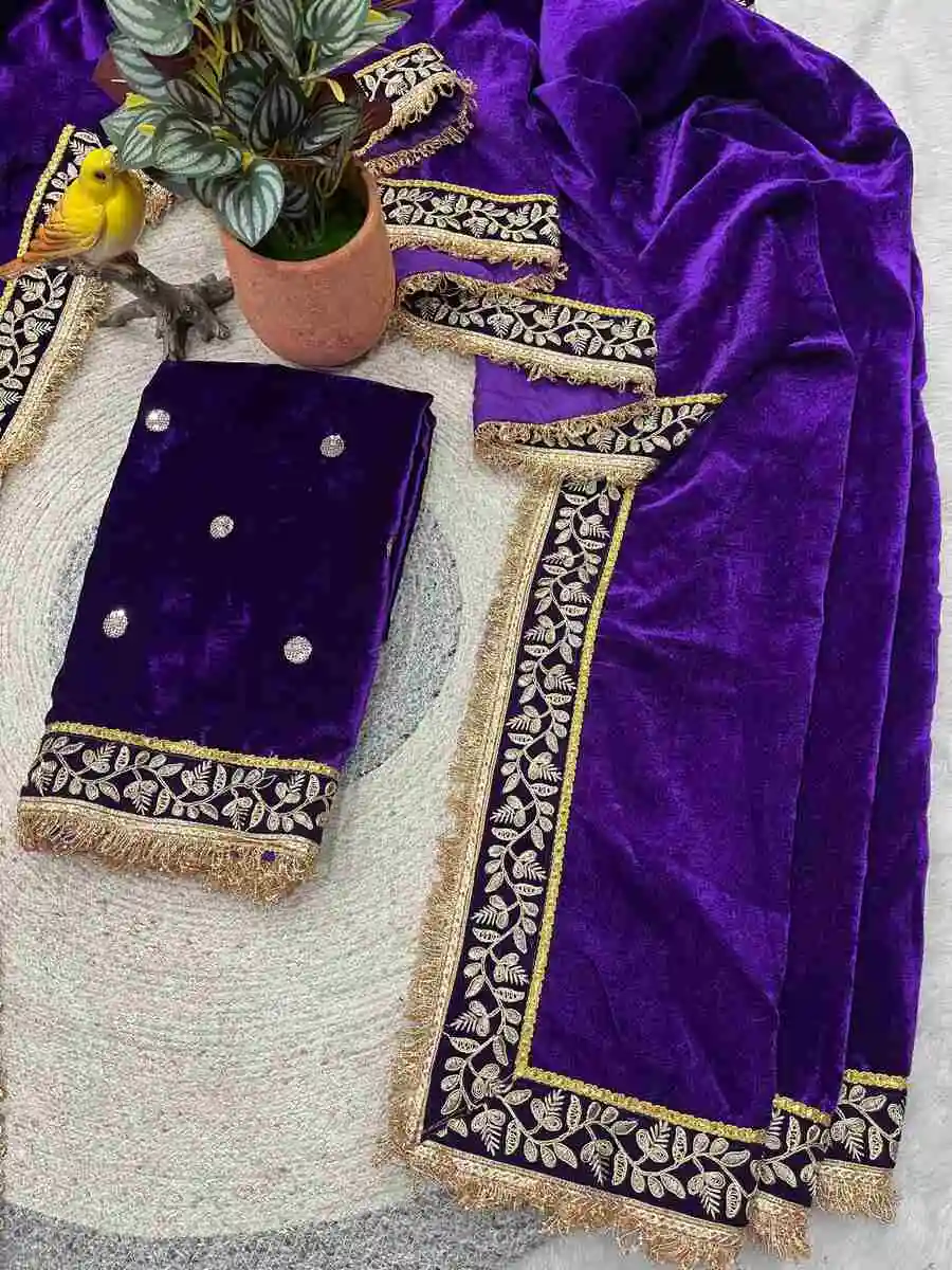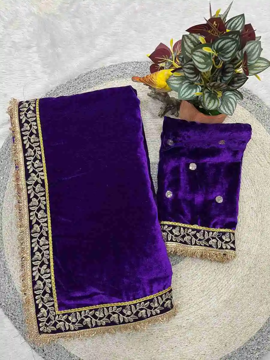 DESIGNER VELVET JARI DORI THREAD EMBROIDERY WORK WITH FANCY FARK BORDER WORK SAREE WITH UNSTITCHED BLOUSE PURPLE
