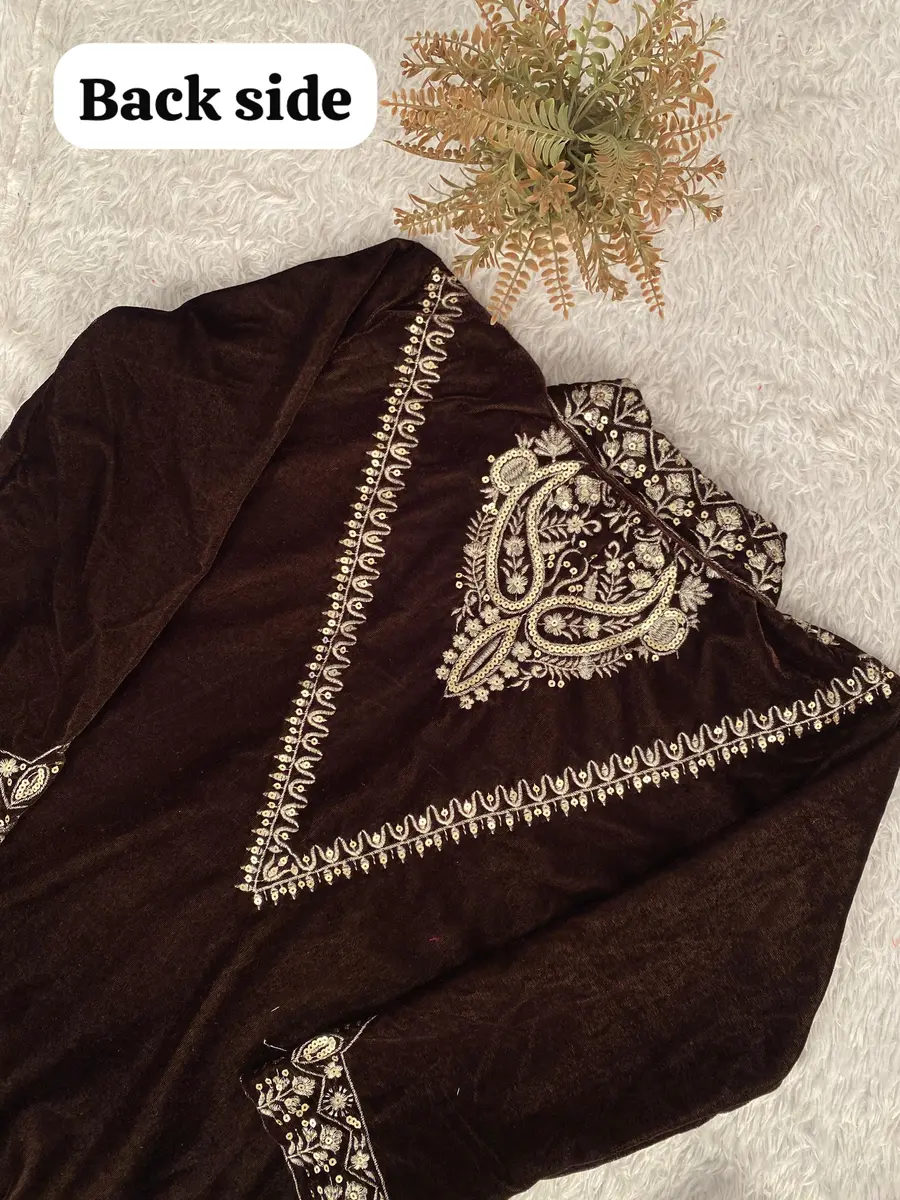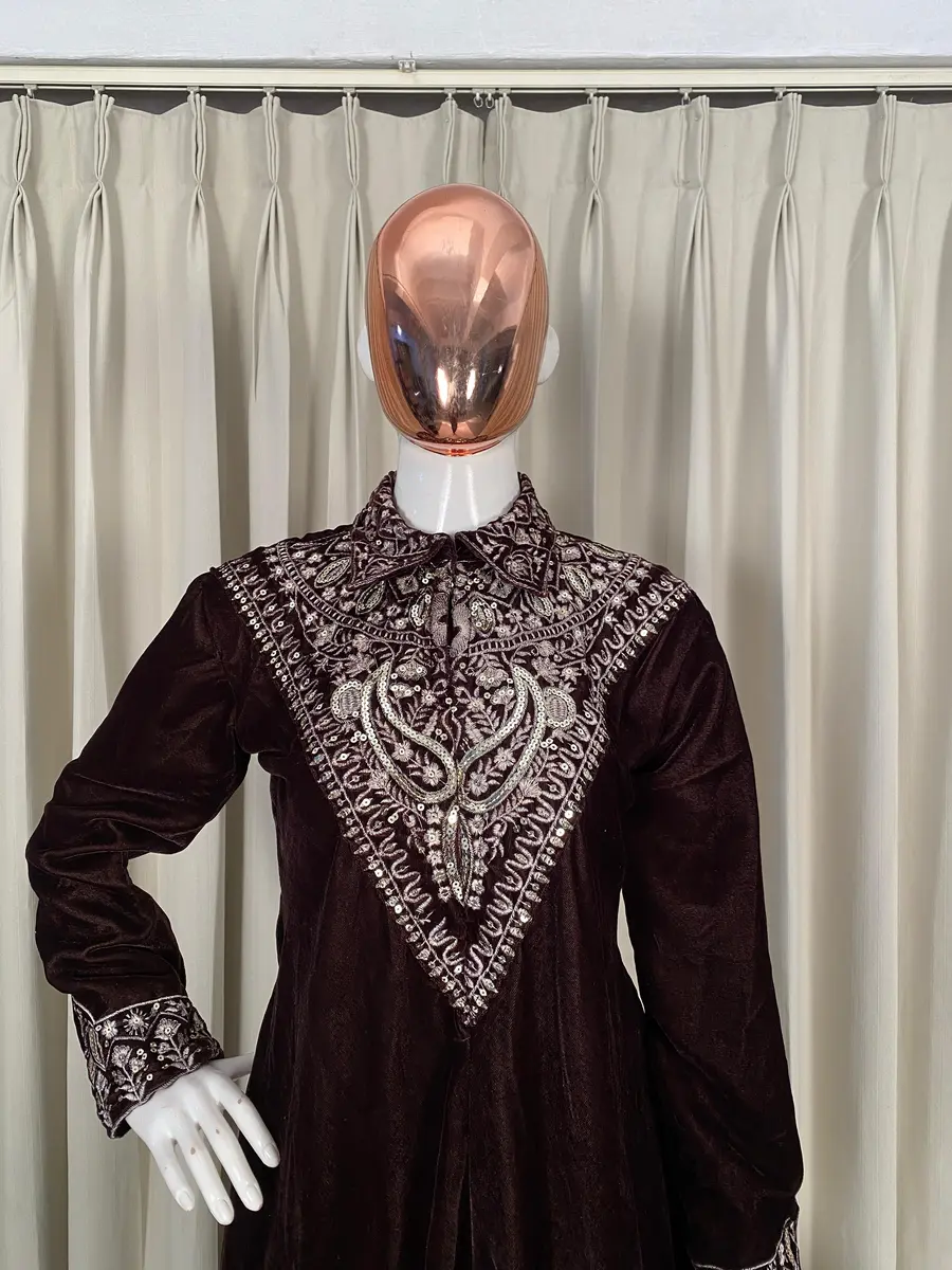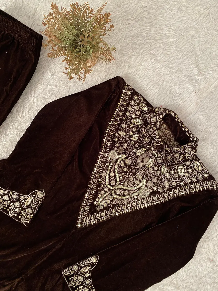 DESIGNER VELVET SEQUENCE EMBROIDERY WORK TOP PALAZZO SET BROWN